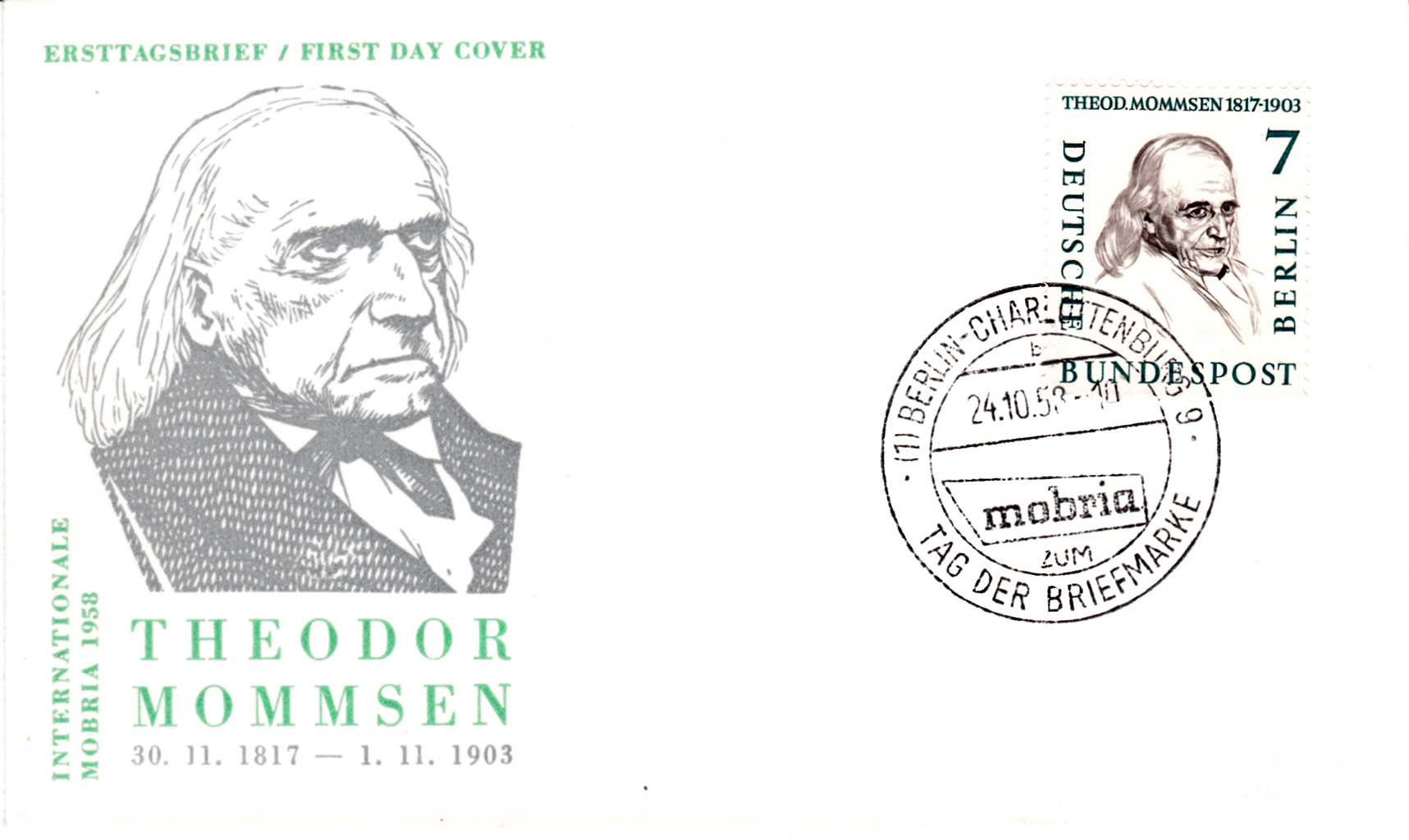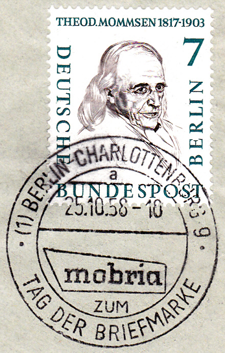 Der gleiche Sonderstempel wurde auch bereits am 24.10.1958 eingesetzt, wie dieser Abschlag auf einem leider nicht verschickten Umschlag mit einer Marke zu 7Pf Theodor Mommsen aus der Serie "Männer aus der Geschichte Berlins", die am 34.10.1958 erschien.