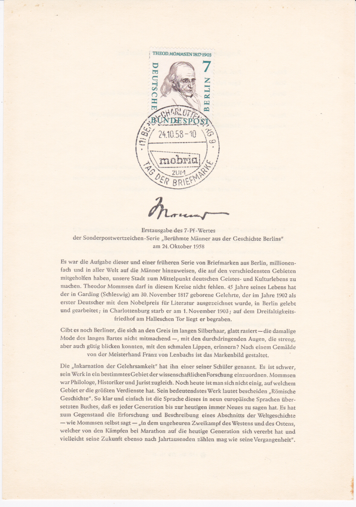 Der gleiche Sonderstempel wurde auch bereits am 24.10.1958 eingesetzt, wie dieser Abschlag auf einem leider nicht verschickten Umschlag mit einer Marke zu 7Pf Theodor Mommsen aus der Serie "Männer aus der Geschichte Berlins", die am 34.10.1958 erschien.