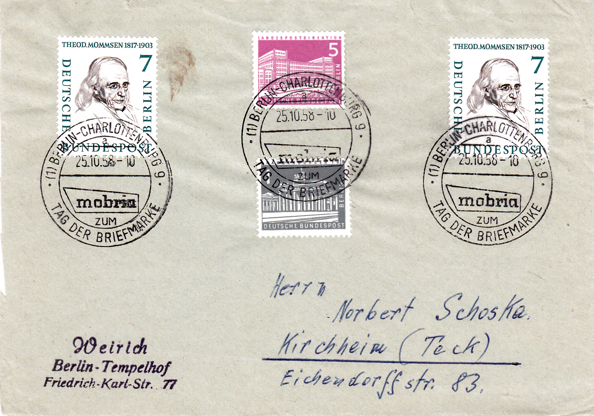 Sonderstempel aus Berlin-Charlottenburg vom 25.10.1958 zur "mobria" zum Tag der Briefmarke 1958