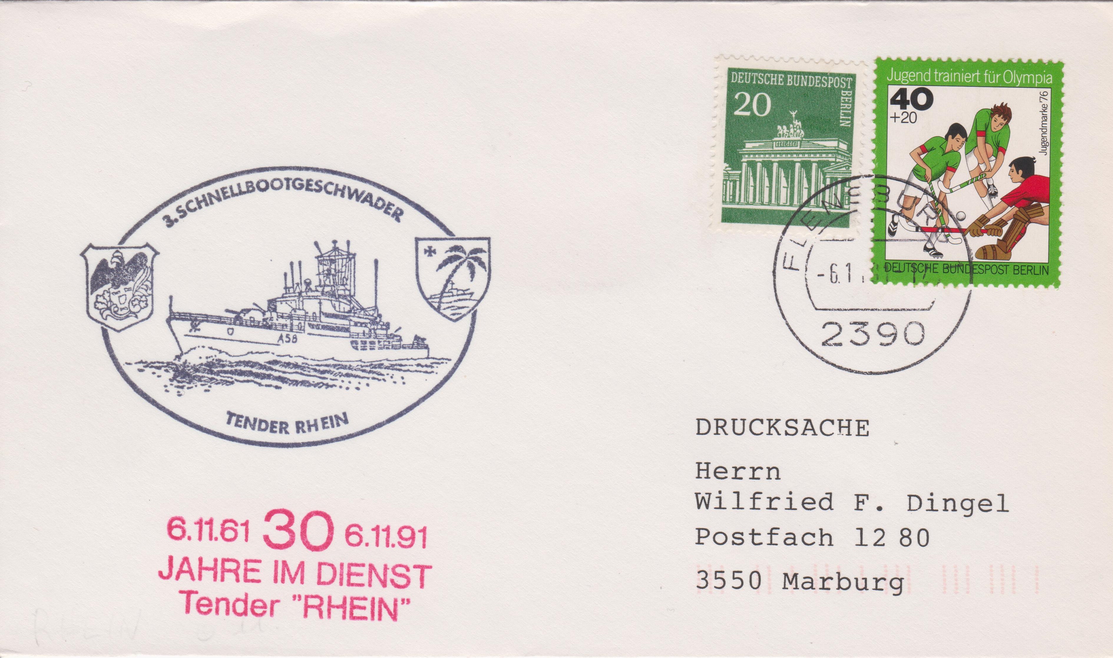 Dieser am 06.11.1991 in FLENSBURG aufgegebene Beleg dokumentiert das Jubiläum "30 JAHRE IM DIENST" von TEMDER RHEIN, A 58: