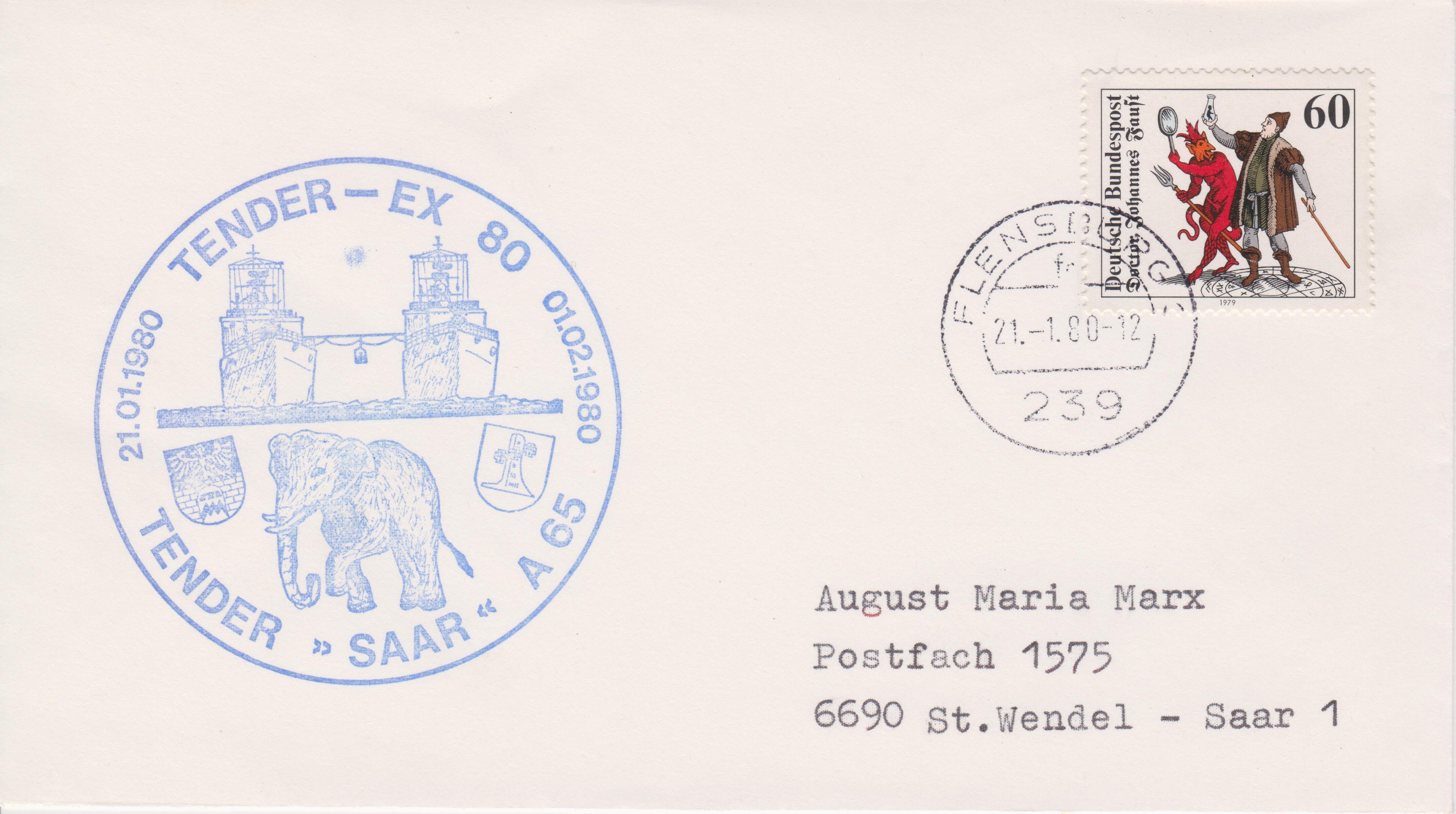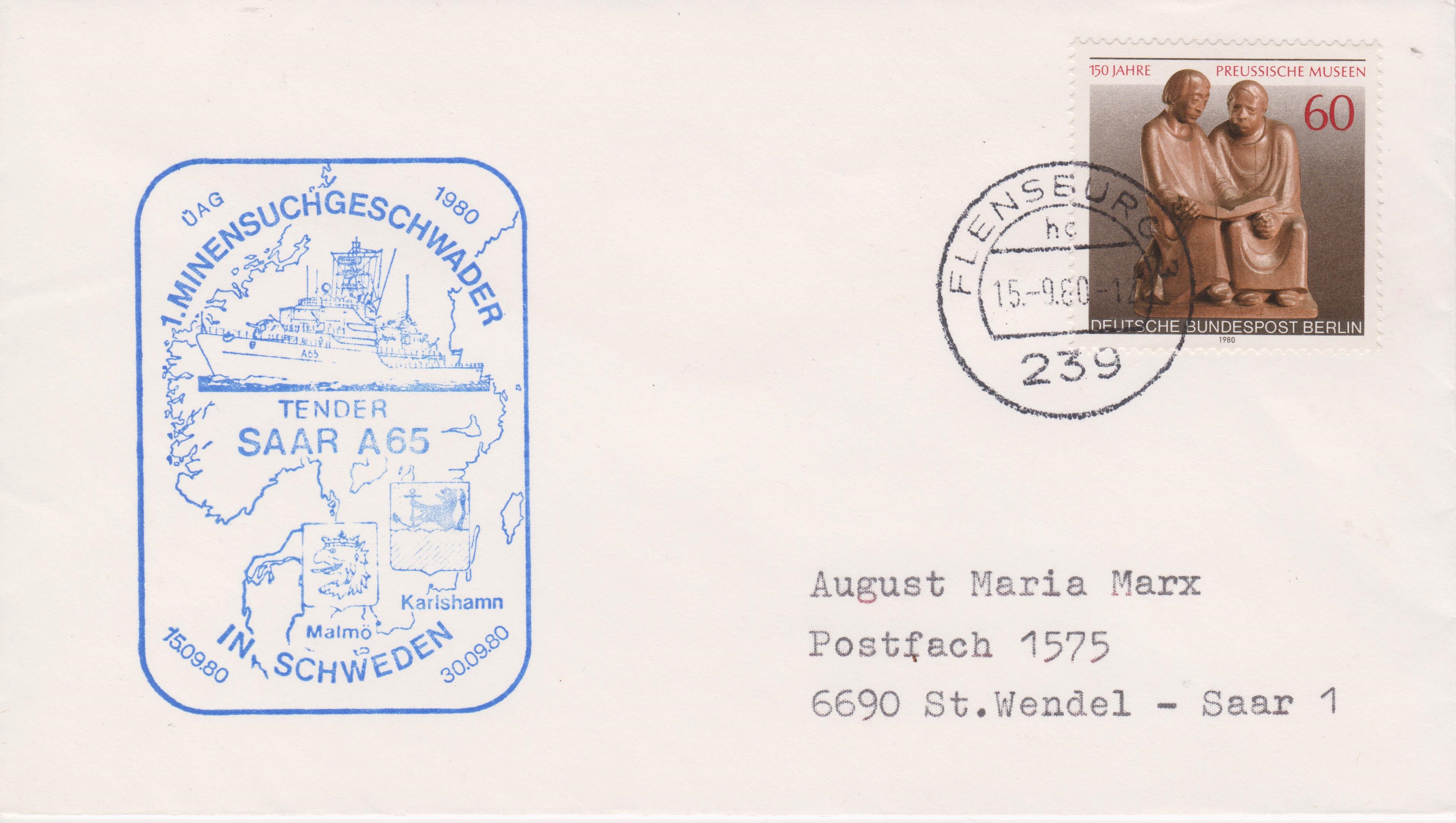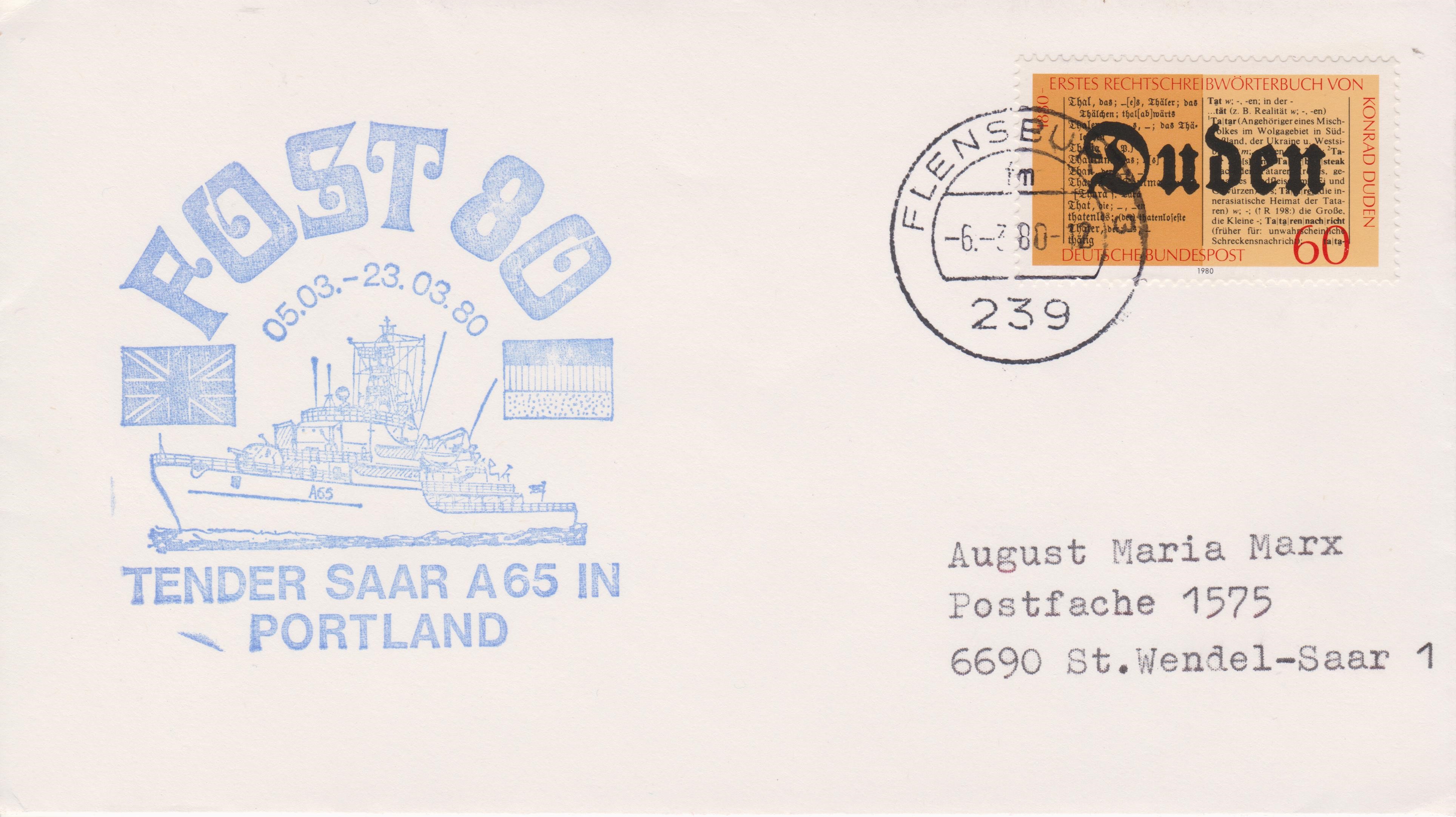 Vom 05.03.1980 bis 23.03.1980 lief die Übung FOST 80, zu der der TENDER SAAR A 65 nach PORTLAND in Großbritannien verlegte. Dieser Beled wurde am 06.03.1980 in FLENSBURG der Post zur Beförderung übergeben::