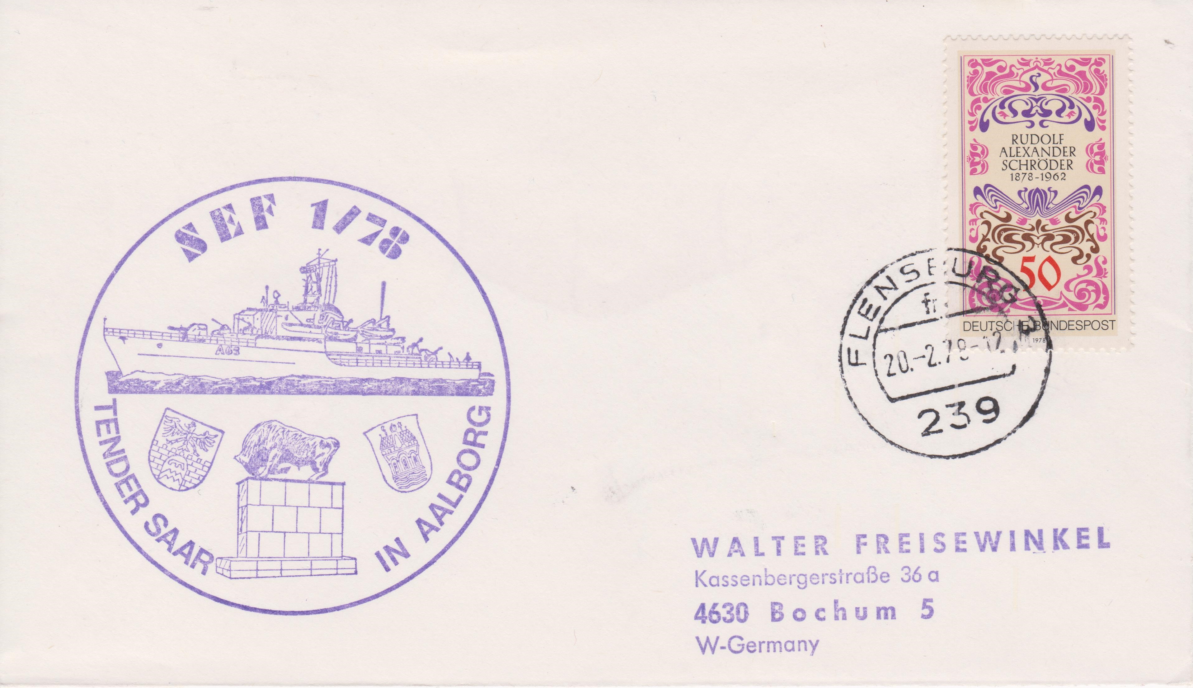 Drucksache in Briefform mit Cachetstempel in Rot "1. MINENSUCHGESCHWADER TENDER SAAR ÜAG 22.AUG.-13.SEPT.1978", aufgegeben am 04.09.1978 in FREDERIKSHAVN in Dänemark:
