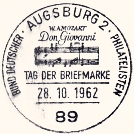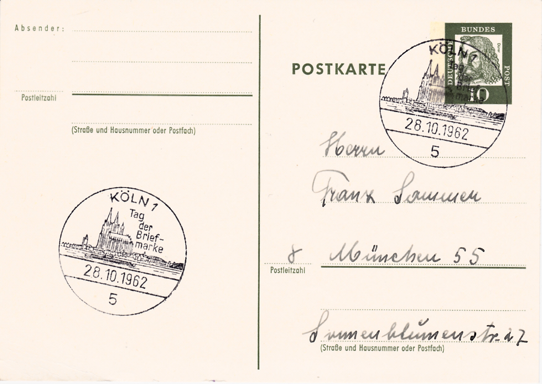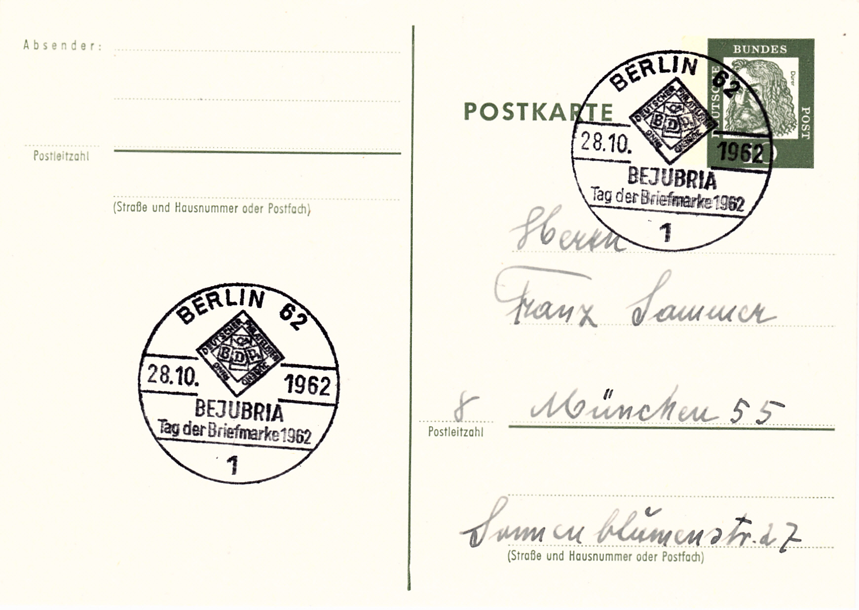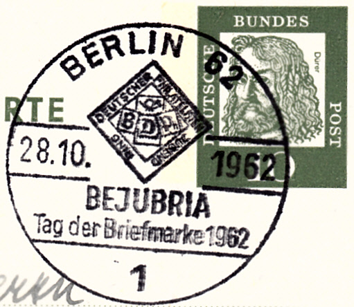 Postkarte mit dem Sonderstempel vom 28.10.1962 aus Berlin zum Tag der Briefmarke 1962 bei der BEJUBRIA (BErliner JUgend BRIefmarken Ausstellung). Im Stempelbild ist das Verbandsemblem des Ringes Deutscher Philatelisten Jugend e.V. (heute: Deutsche Philatelisten Jugend e.V.) abgebildet.