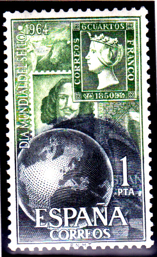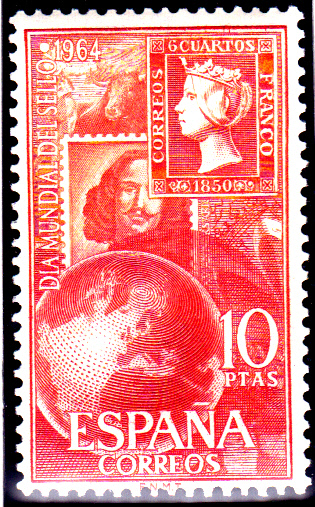 Spanien verausgabte auch zum Welttag der Briefmarke 1964 eine Serie mit drei Marken. Im Markenbild sind die Marken MiNr. 1, 1140, 1158 und 1254 sowie eine Weltkugel zu sehen.