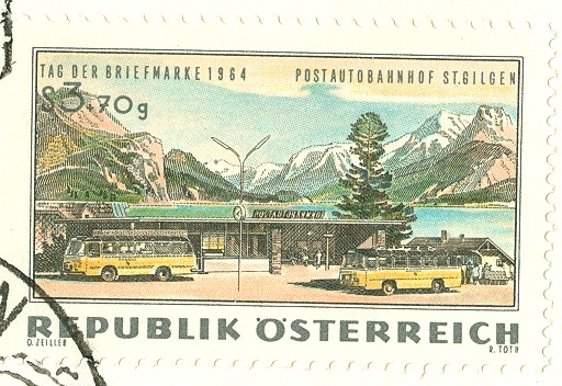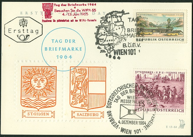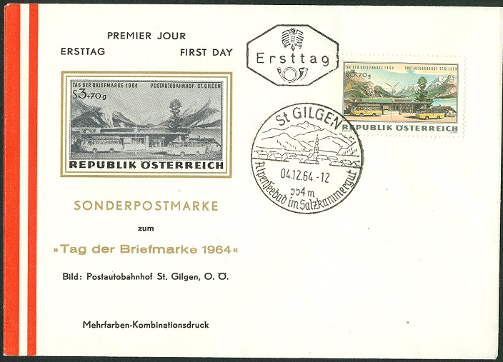 Eine Ausgabe zum Tag der Briefmarke erschien auch im Jahr 1964. Und schön, dass auch hier passend ein Ortsstempel auf diesem FDC abgeschlagen wurde, zeigt doch die Marke den "Postautobahnhof" in St. Gilgen.
