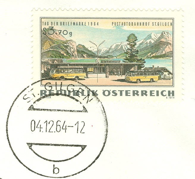 Eine Ausgabe zum Tag der Briefmarke erschien auch im Jahr 1964. Und schön, dass auch hier passend ein Ortsstempel auf diesem FDC abgeschlagen wurde, zeigt doch die Marke den "Postautobahnhof" in St. Gilgen.