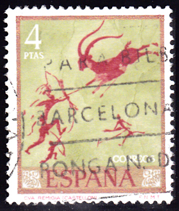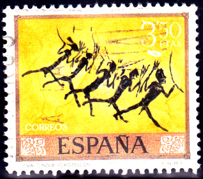 Auch 1967 ist in Spanien am 27.3.1967 eine Serie mit zehn Werten zum Tag der Briefmarke erschienen. Als Motive wurden prähistorische Felsmalereien benutzt. Hier zeige ich den Wert zu 3,50 Pts (MiNr 1672) mit dem Motiv "Auszug der fünf Bogenschützen", eine Malerei in Grauschwarz aus der Gasulla-Schlucht in der Provinz Castellón.