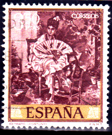 Am 25.3.1968 erschien in Spanien eine Serie mit zehn Marken zum Tag der Briefmmarke 1968 mit Gemäldemotiven von Mariano Fortuny y Carbó. Aus dieser Serie zeige ich hier den Wert zu 3.50 Ptas (MiNr 1747) mit dem Werk "Dame mit Fächer" (Señora Gaye, Sekretärs-Gattin des Duque de Rianzares), um 1865.