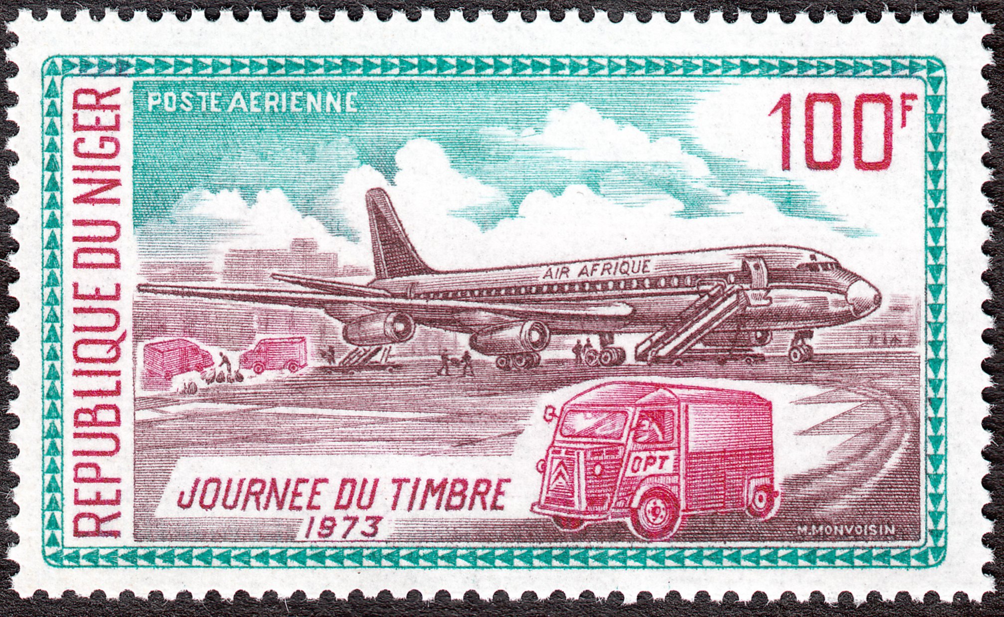 Diese Marke aus der Republik Niger zeigt im Vordergrund einen Kleintransporter der Post: