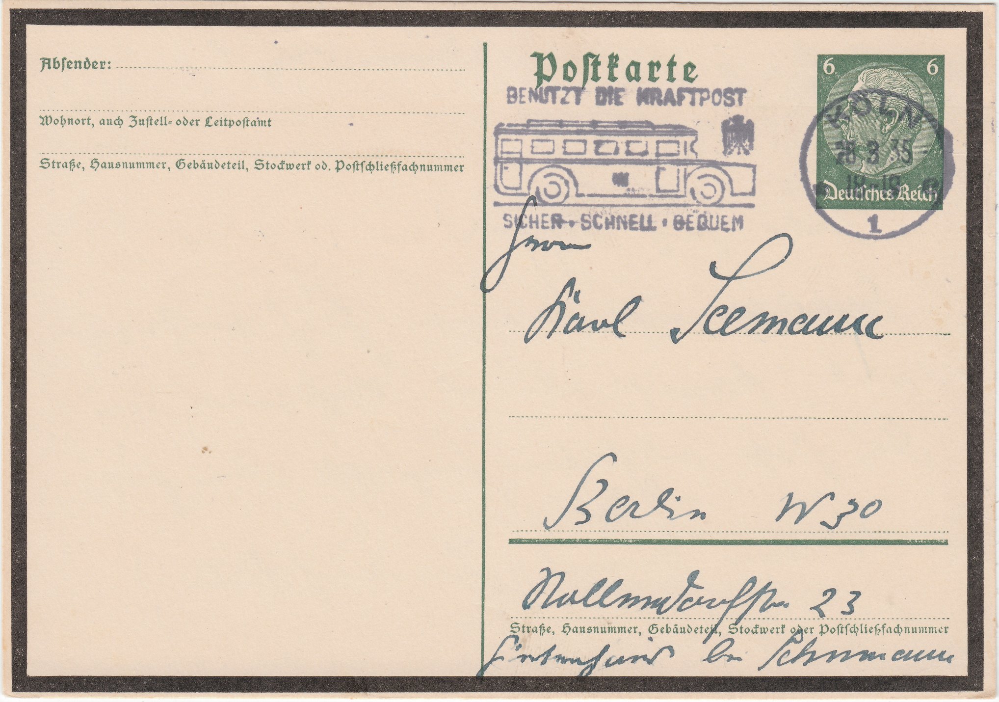 Mit diesem Maschinenstempel machte die Deutsche Reichspost 1935 in Köln Eigenwerbung für die Benutzung der Kraftpost, die als "SICHER SCHNELL BEQUEM" beworben wird: