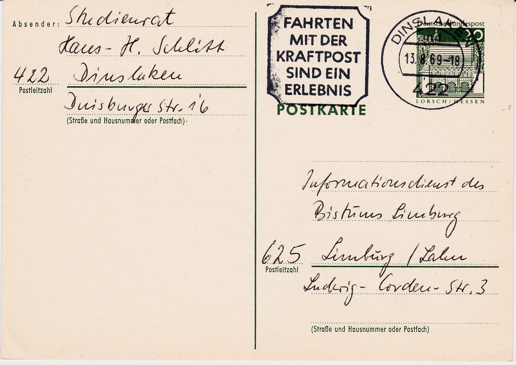 Maschinenwerbestempel vom 13.8.1969 aus 422 Dinslaken mit dem Werbeeinsatz "Fahrten mit der Kraftpost sind ein Erlebnis".
