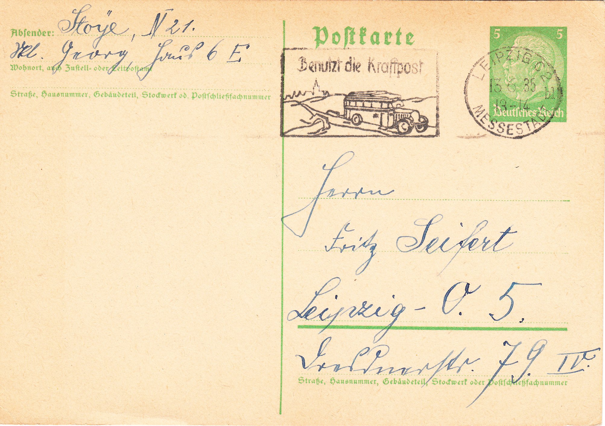 Maschinenstempel vom 13.05.1936 aus Leipzig mit Werbeeinsatz "Benutzt die Kraftpost" mit Darstellung eines zeitgenössischen Omnibusses der Kraftpost: