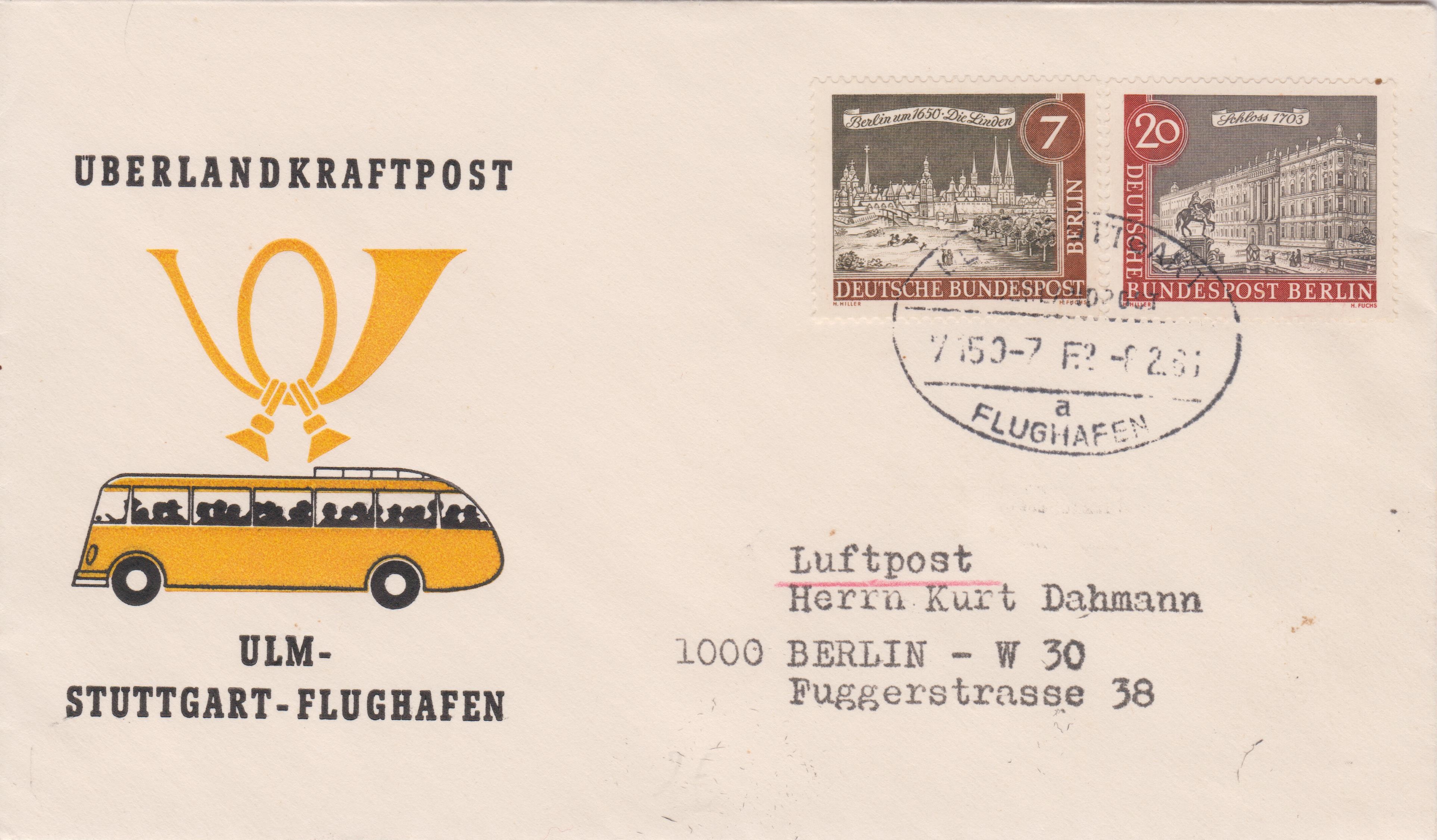 Dieser nach Berlin adressierte Brief wurde am 08.02.1961 per "ÜBERLANDKRAFTPOST" per Postbus auf der Strecke "ULM - STUTTGART-FLUGHAFEN" befördert und dann von Stuttgart-Flughafen nach Berlin per Luftpost: