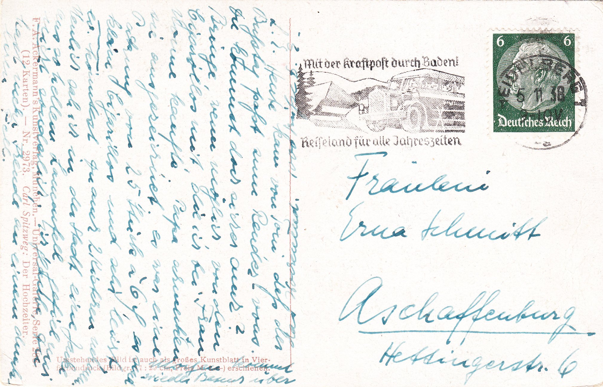 Dieser Maschinenstempel vom 05.11.1938 aus "HEIDELBERG" zeigt einen Werbeeinsatz "Mit der Kraftpost durch Baden! Reiseland für alle Jahreszeiten":