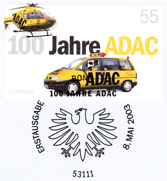 Zum Jubiläum "100 Jahre ADAC" ist bei der Deutschen Post AG eine Marke (MiNr 2340) mit der Abbildung eines Hubschraubers und eines Straßendienstfahrzeuges des ADAC erschienen.