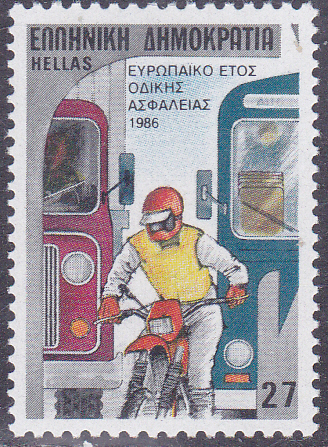 Zum Europäischen Jahr der Verkehrssicherheit erschien 1986 in Griechenland diese Marke (MiNr 1627) mit einem Sicherheitsgurt und einem Lenkrad.