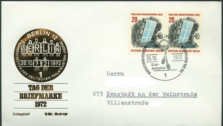 1972 gab es für die Sammlergemeinde zum Tag der Briefmarke eine Einzelmarke (Berlin (West), MiNr. 439). Hier auf einem Ersttagsbrief verklebt.