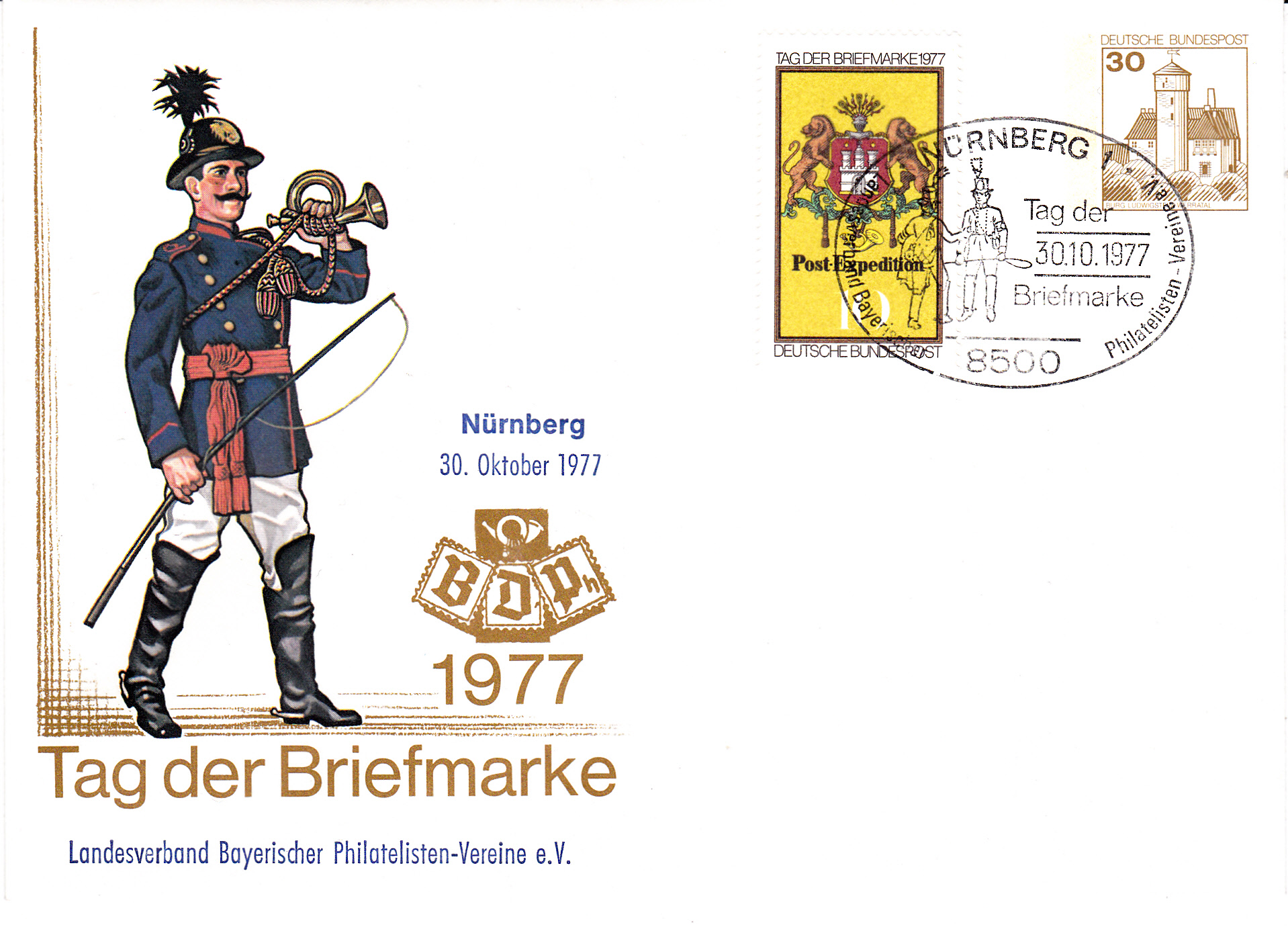 Ganzsache des Landesverbandes Bayerischer-Philatelistenvereine e.V. zum Tag der Briefmarke 1977 mit dem dazu passenden Sonderstempel aus Nürnberg vom 30.10.1977.