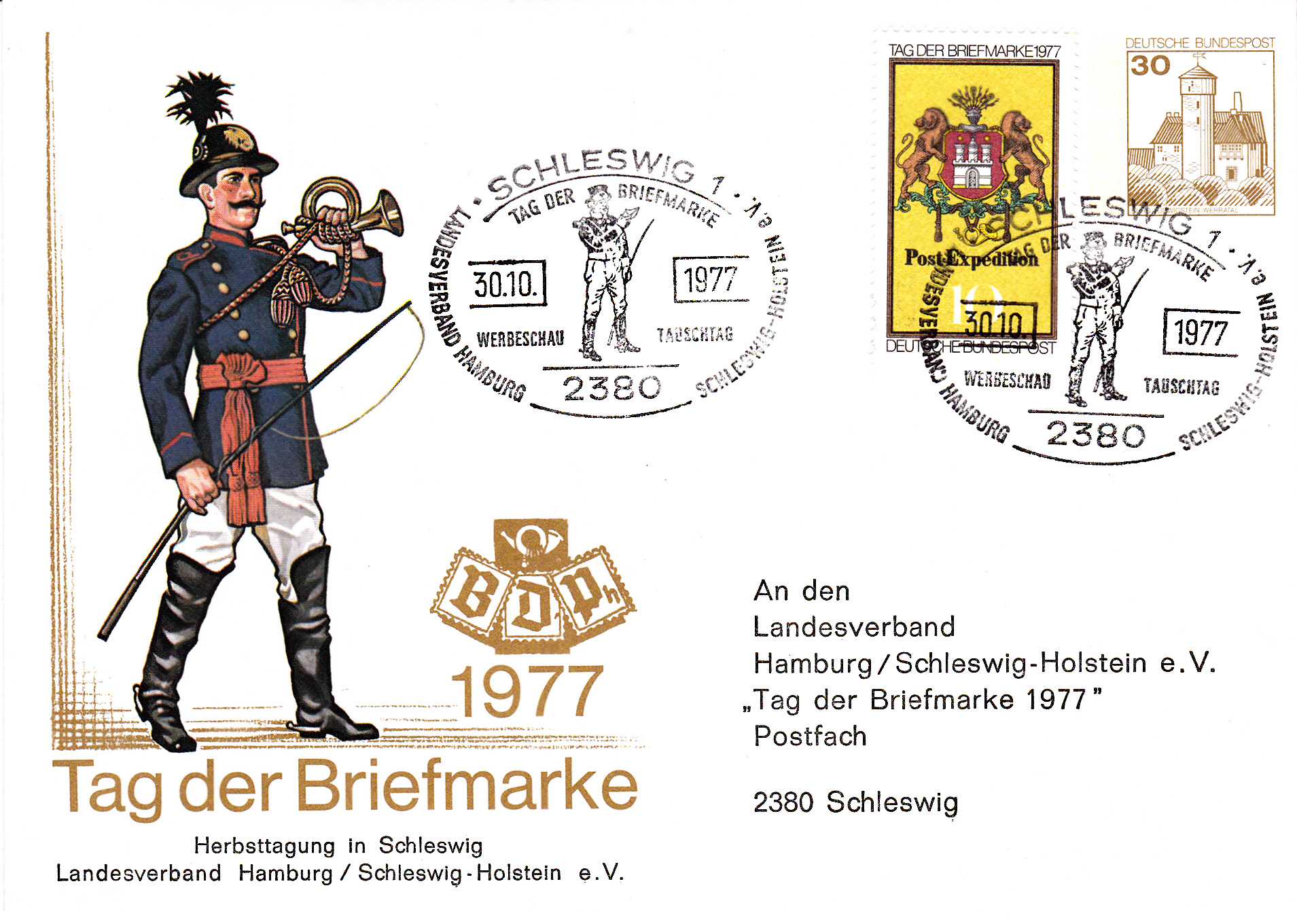 Ganzsache des Landesverbandes Hamburg/Schleswig-Holstein e.V. zum Tag der Briefmarke 1977 mit dem dazu passenden Sonderstempel aus Schleswig vom 30.10.1977.