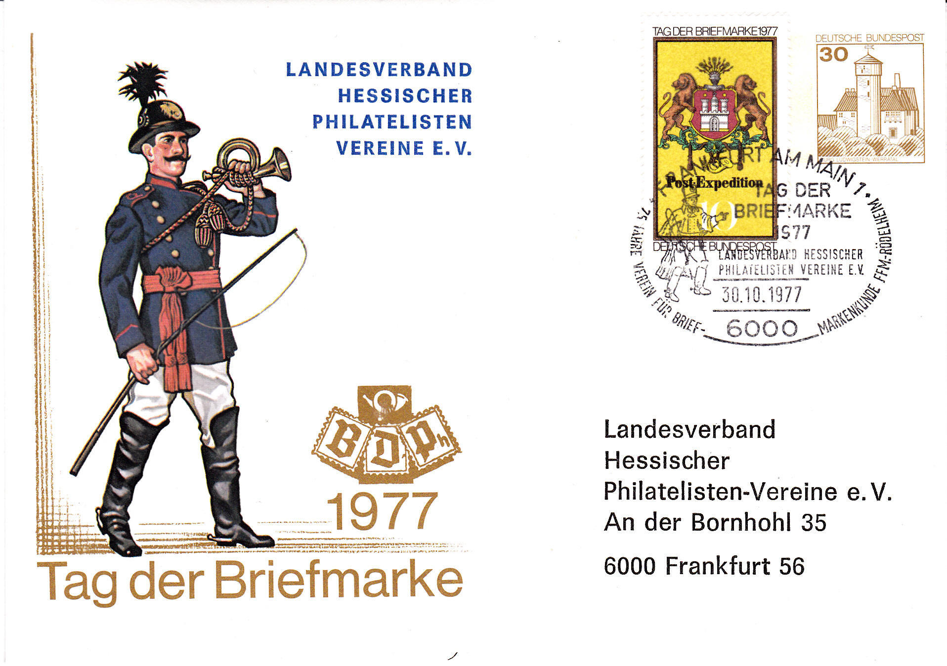 Ganzsache des Landesverbandes Hessischer Philatelisten Vereine e.V. zum Tag der Briefmarke 1977 mit dem dazu passenden Sonderstempel aus Frankfurt am Main vom 30.10.1977.