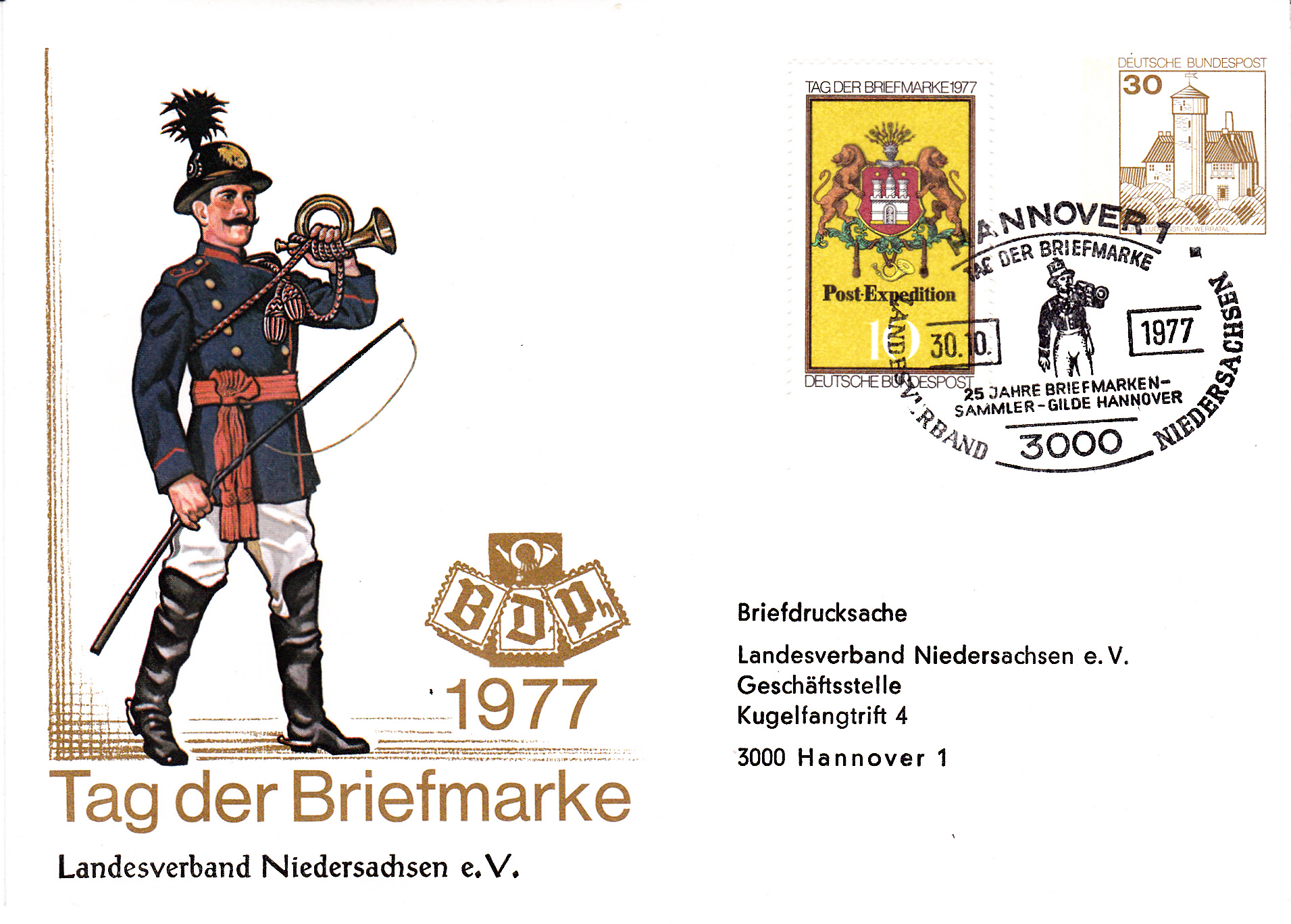 Ganzsache des Landesverbandes Niedersachsen e.V. zum Tag der Briefmarke 1977 mit dem dazu passenden Sonderstempel aus Hannover vom 30.10.1977.
