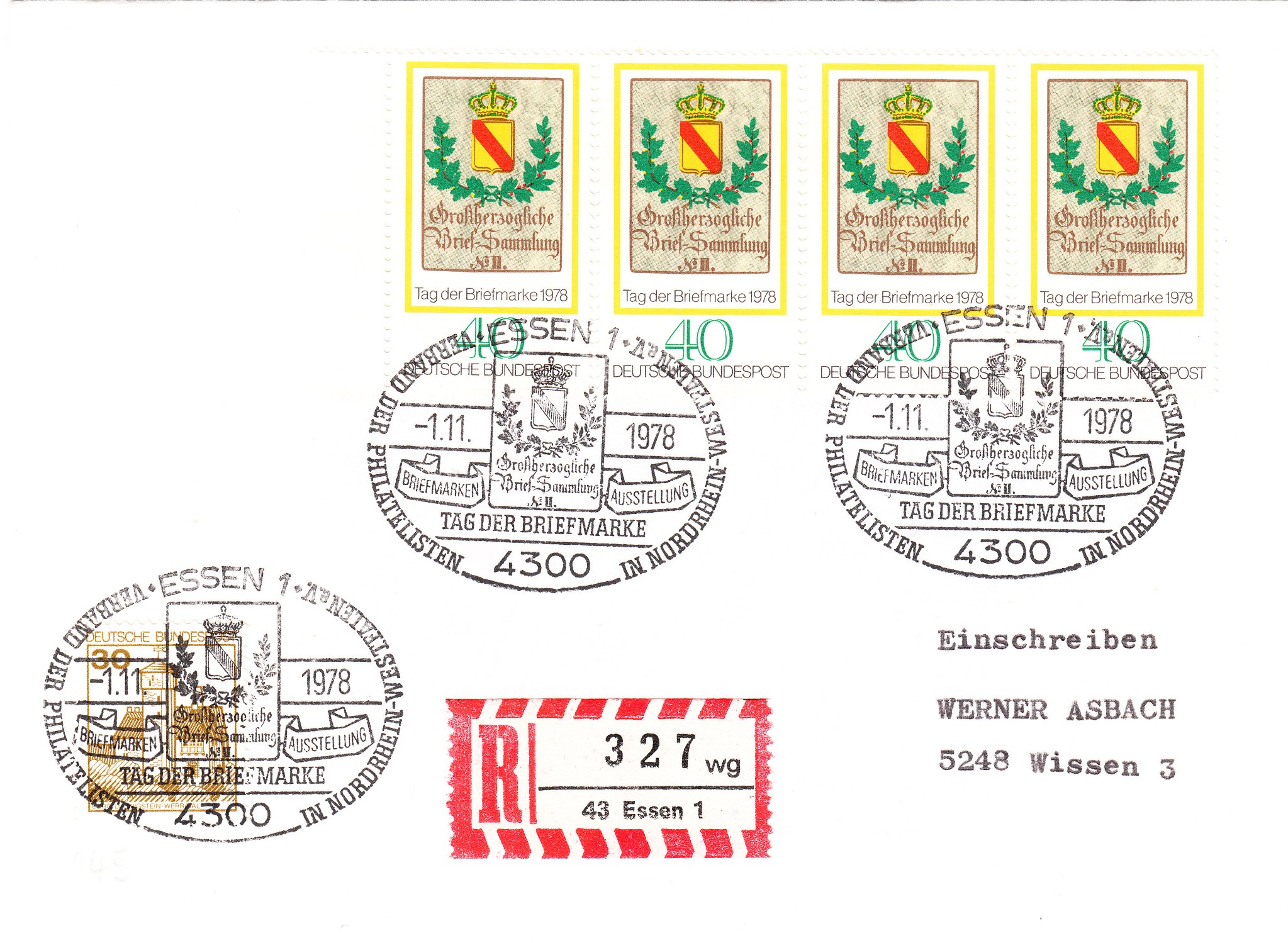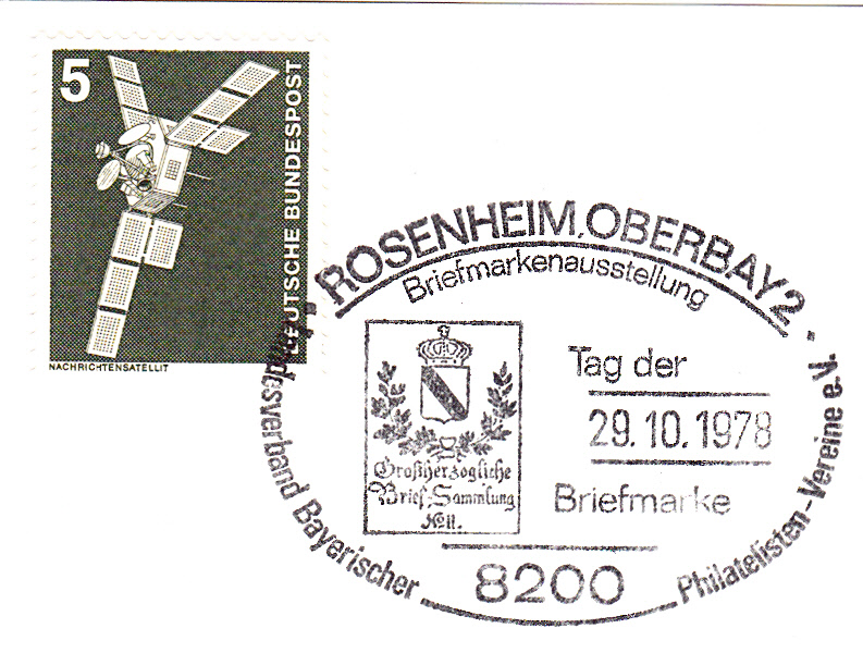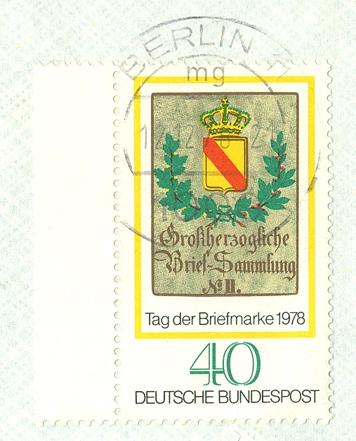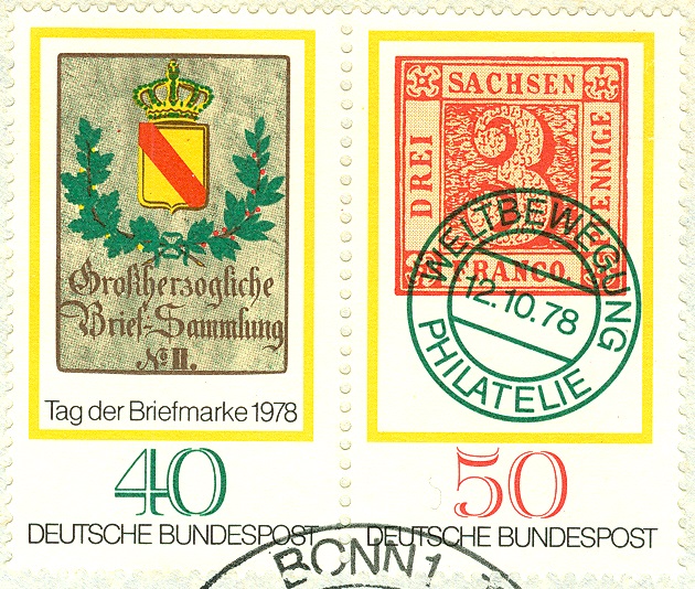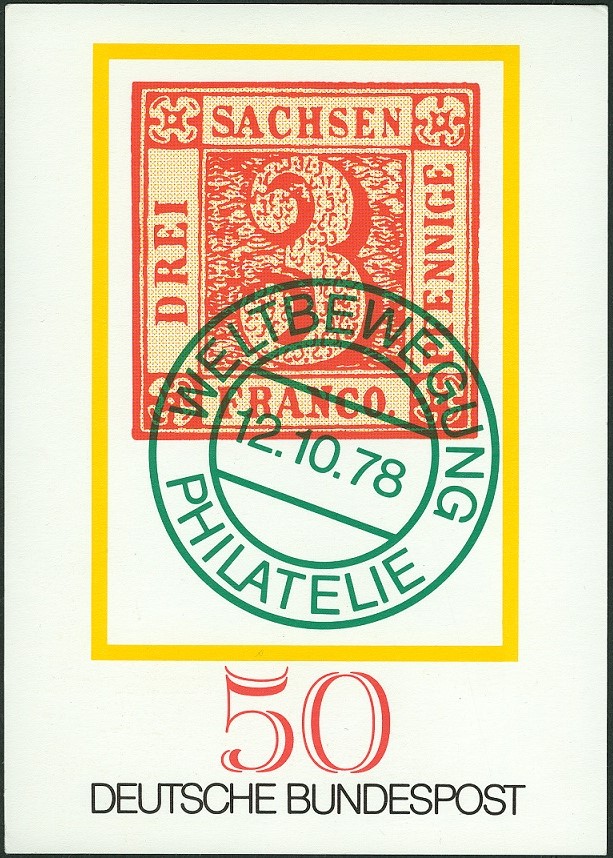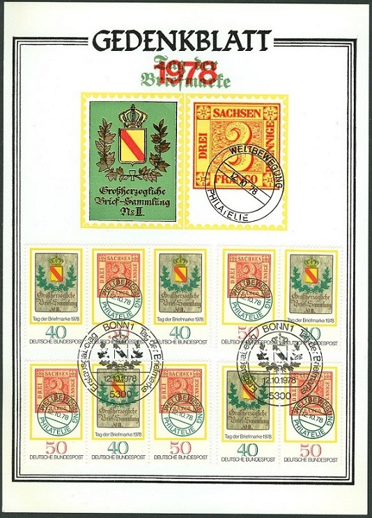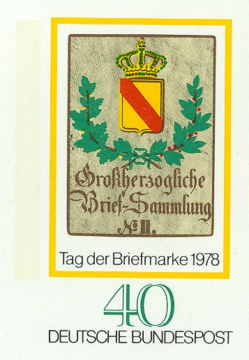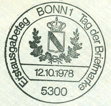 Am 01.11.1978 fand in Essen eine Briefmarkenausstellung zum "TAG DER BRIEFMARKE" statt. Dabei wurde dieser Sonderstempel eingesetzt, der als Motiv das Posthausschild aus dem Jahre 1844 aus Baden zeigt, das auch als Motiv für die am 12.10.1978 erschienene Sondermarke MiNr. 980 gedient hatte: