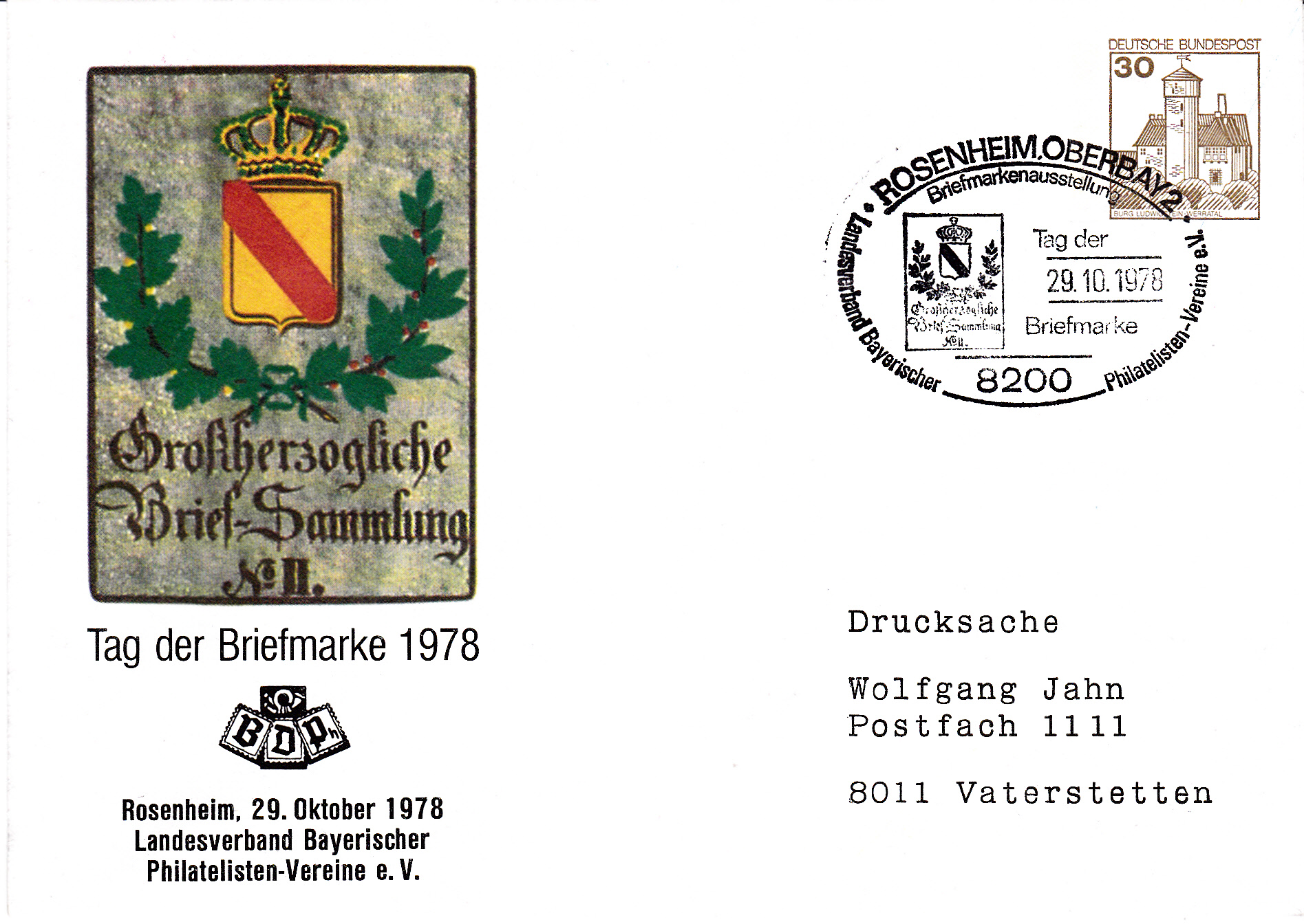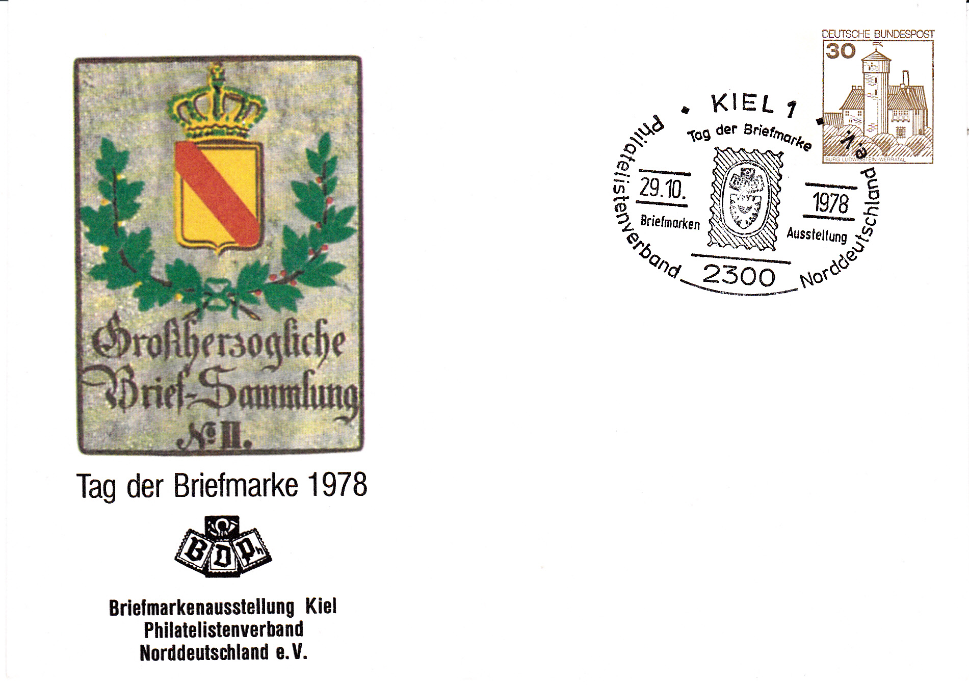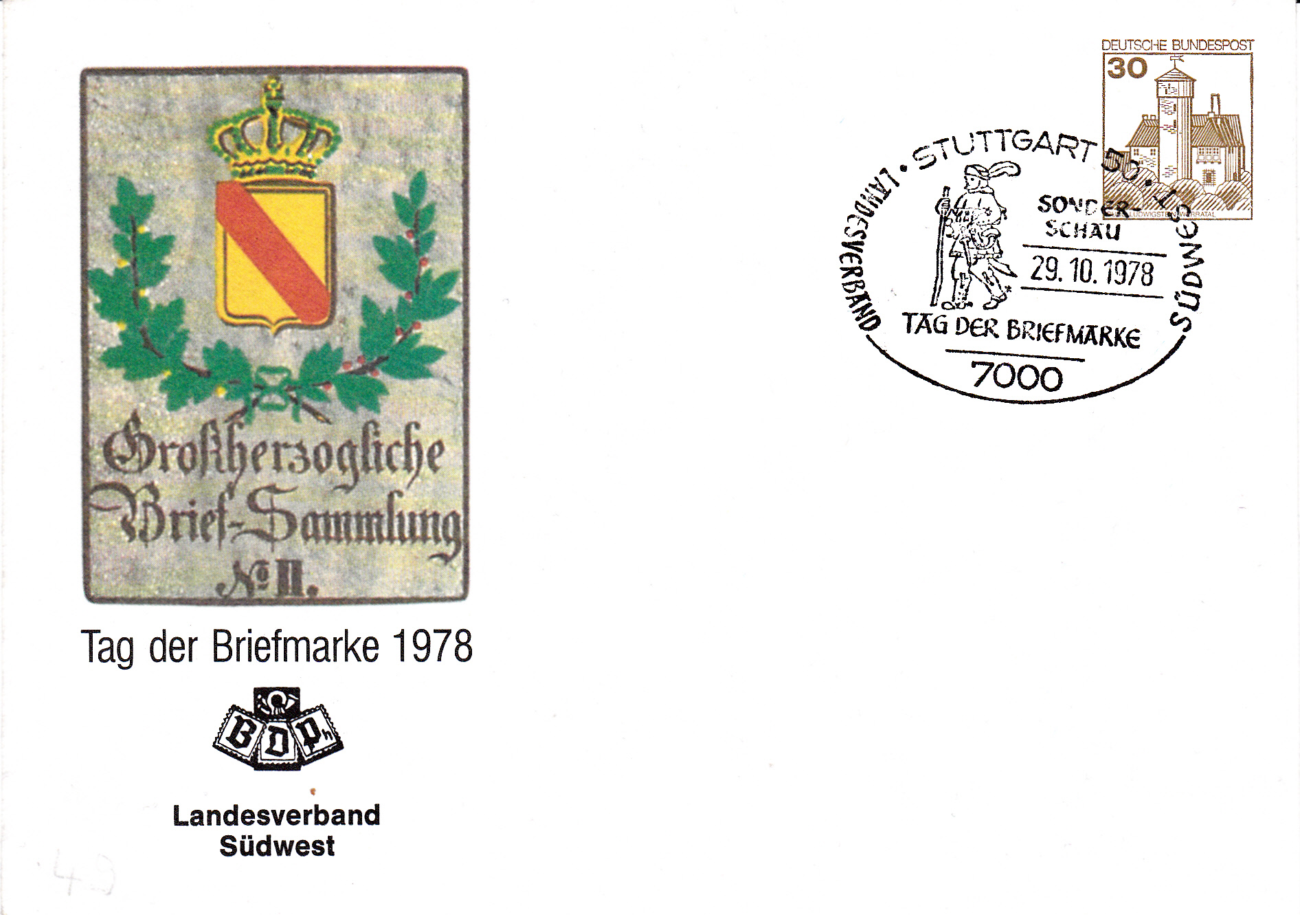 Am 01.11.1978 fand in Essen eine Briefmarkenausstellung zum "TAG DER BRIEFMARKE" statt. Dabei wurde dieser Sonderstempel eingesetzt, der als Motiv das Posthausschild aus dem Jahre 1844 aus Baden zeigt, das auch als Motiv für die am 12.10.1978 erschienene Sondermarke MiNr. 980 gedient hatte: