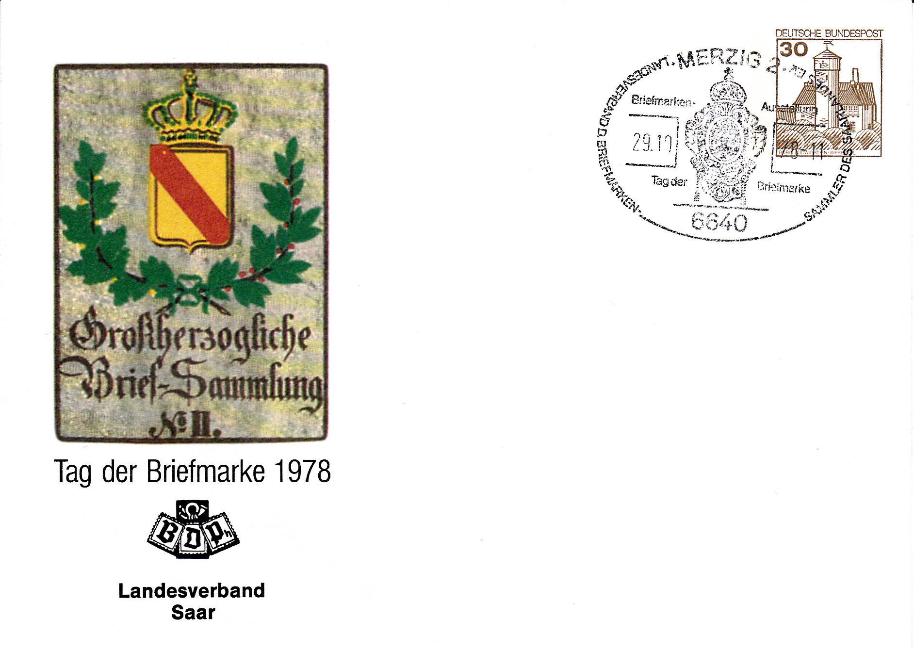 Ganzsachenumschlag des Landesverbandes Saar e.V. zum Tag der Briefmarke 1978 mit dem dazu passenden Sonderstempel vom 29.10.1978 aus Merzig.
