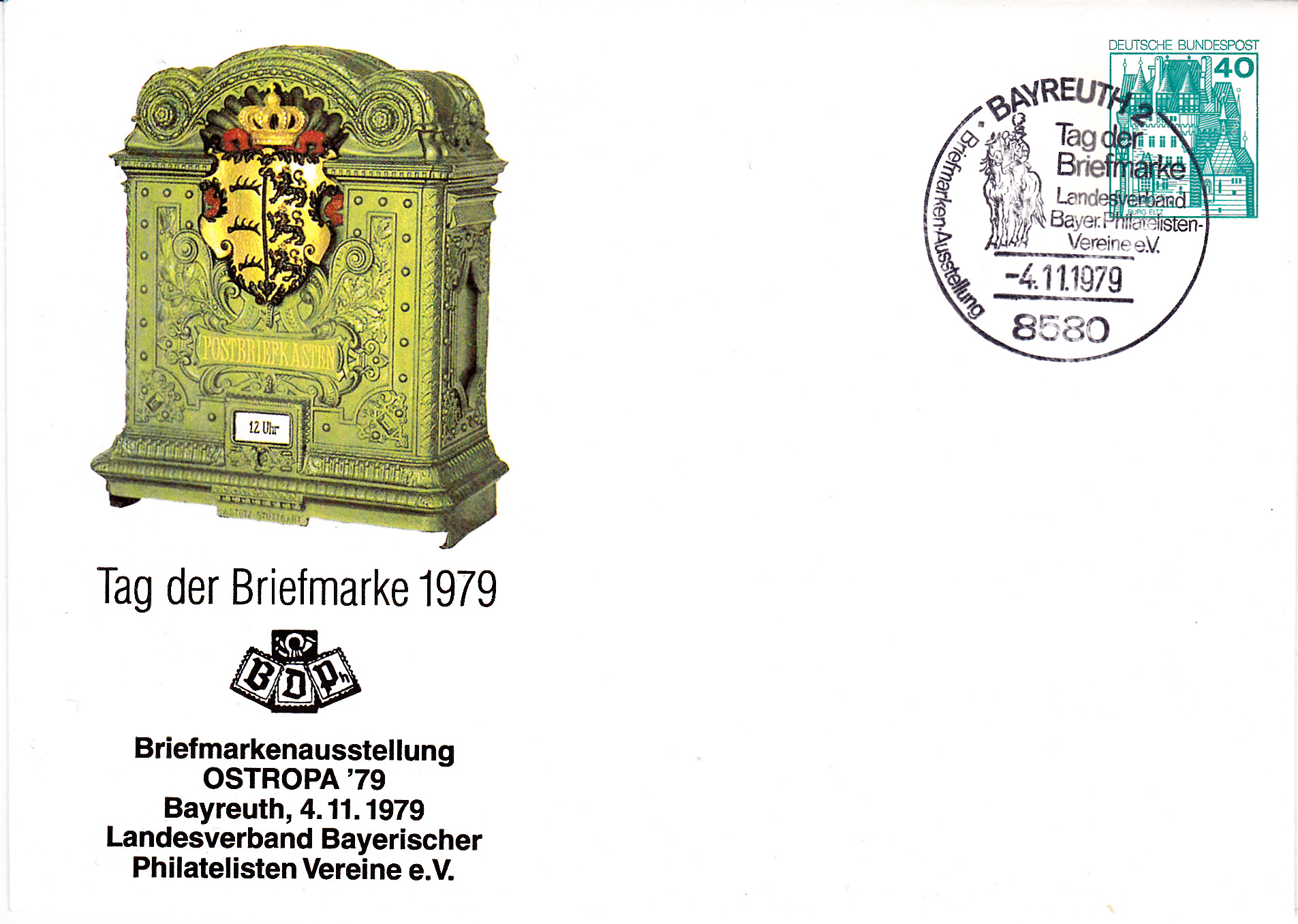 Ganzsachenumschlag zum Tag der Briefmarke 1979 mit dem Sonderstempel des LV Bayern e.V. zum TdB 1979 vom 4.11.1979 aus Bayreuth.