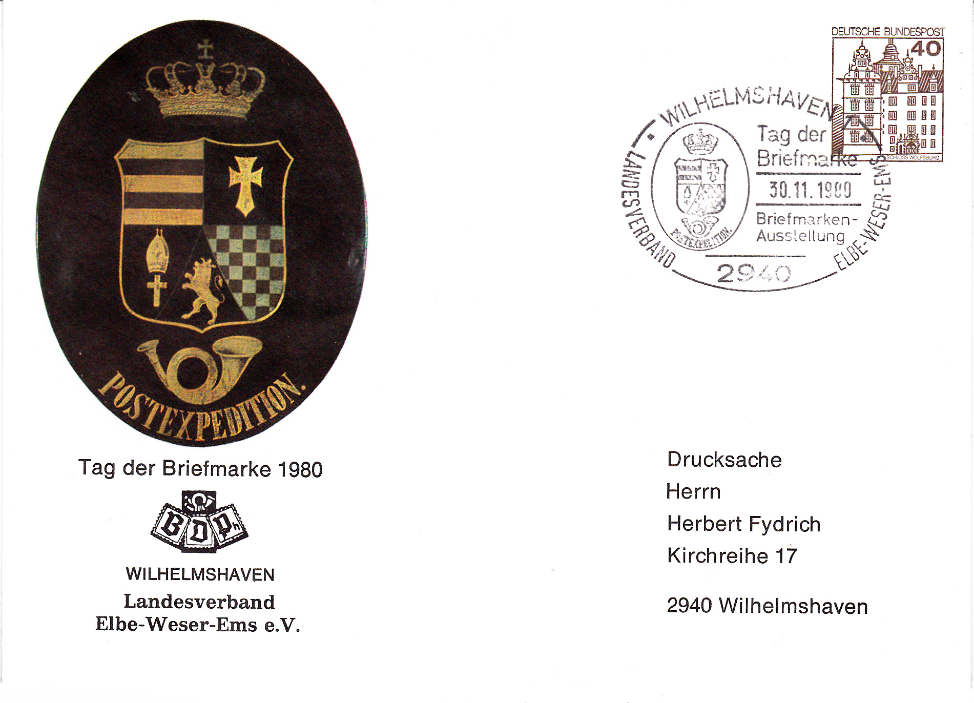 Ganzsachenumschlag zum Tag der Briefmarke 1980 des Landesverbandes Elbe-Weser-Ems e.V. mit dem dazu gehörenden Sonderstempel aus Wilhelmshaven.