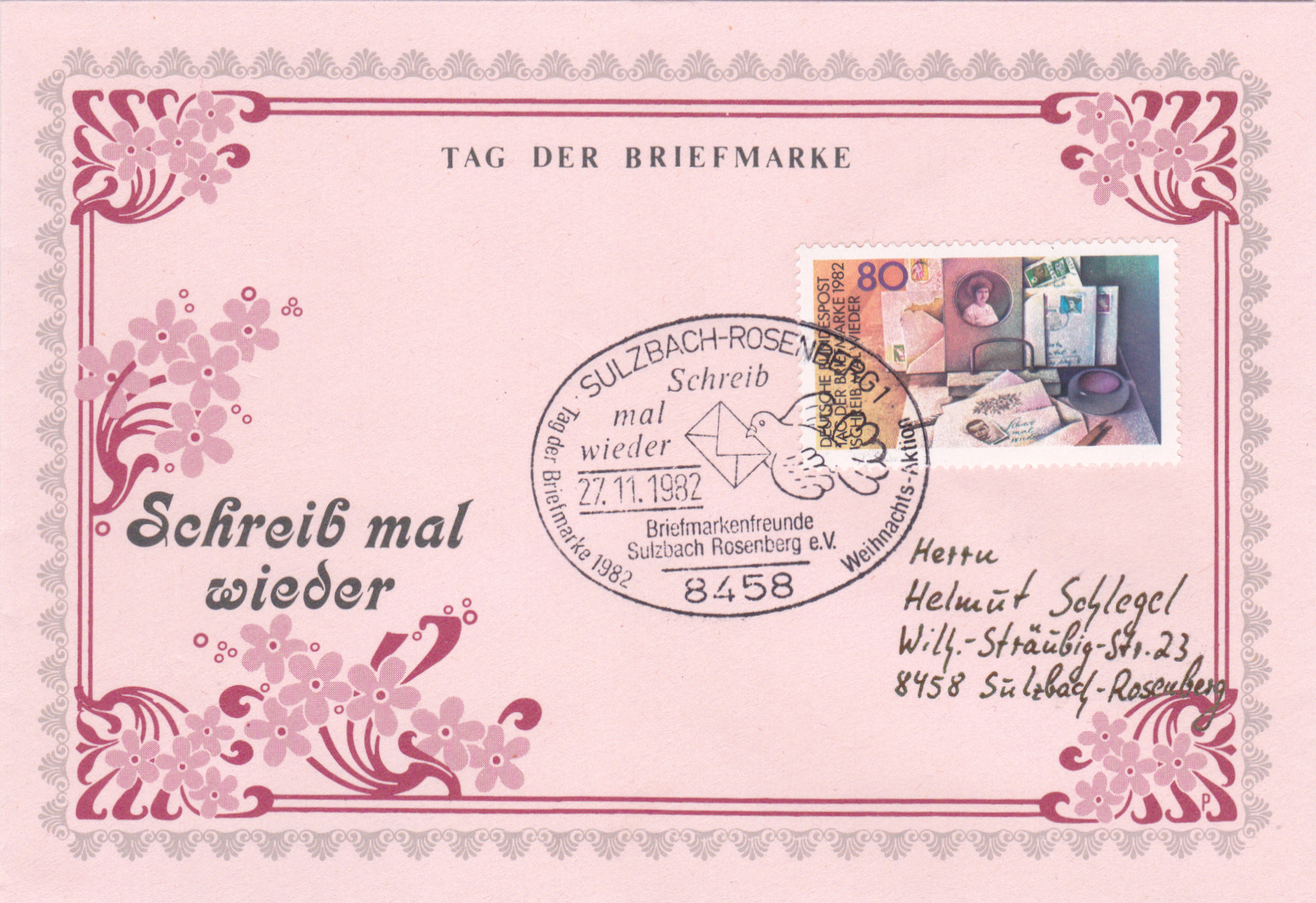 Diesen Sonderstempel aus Sulzbach-Rosenberg zum Tag der Briefmarke 1982gibt es auch mit dem Datum 27.11.1982.