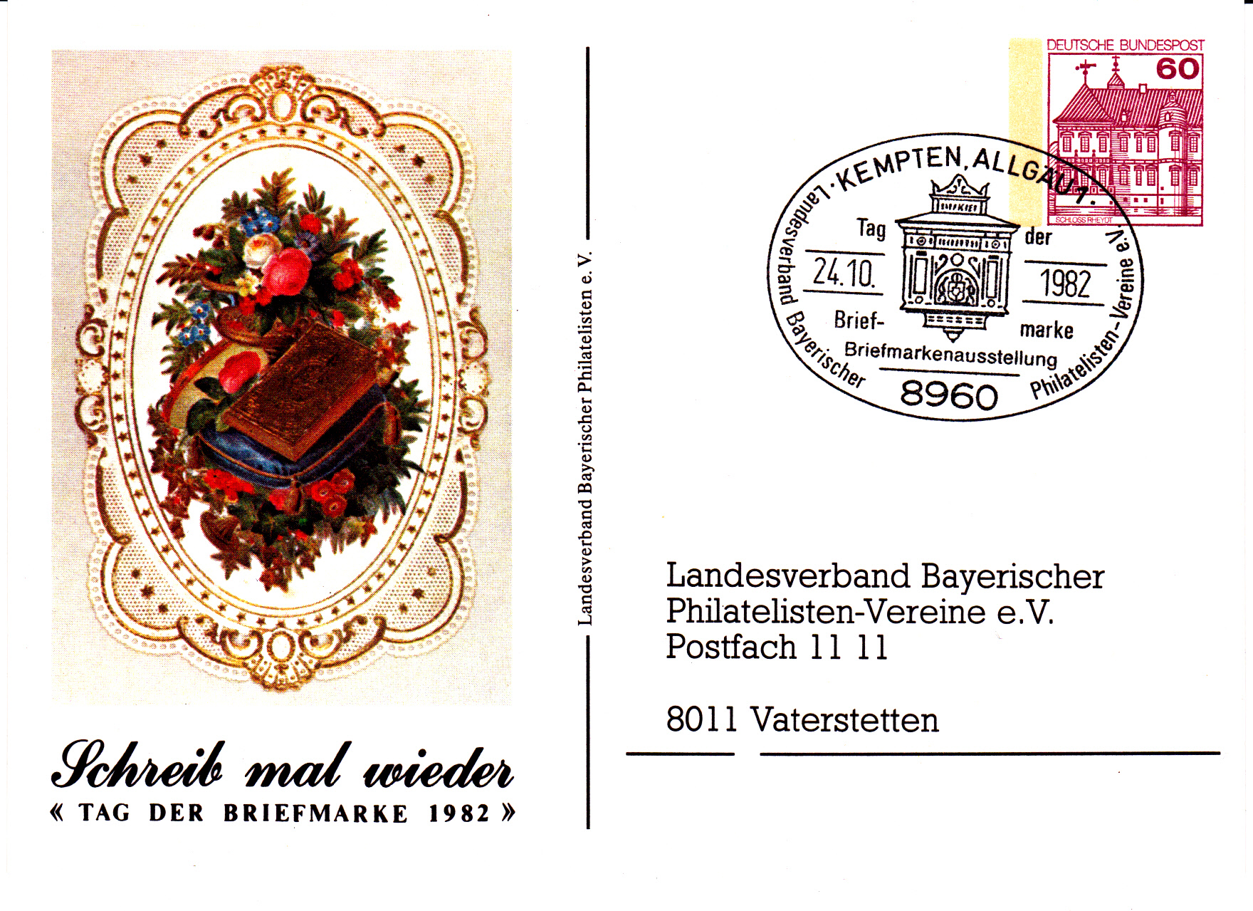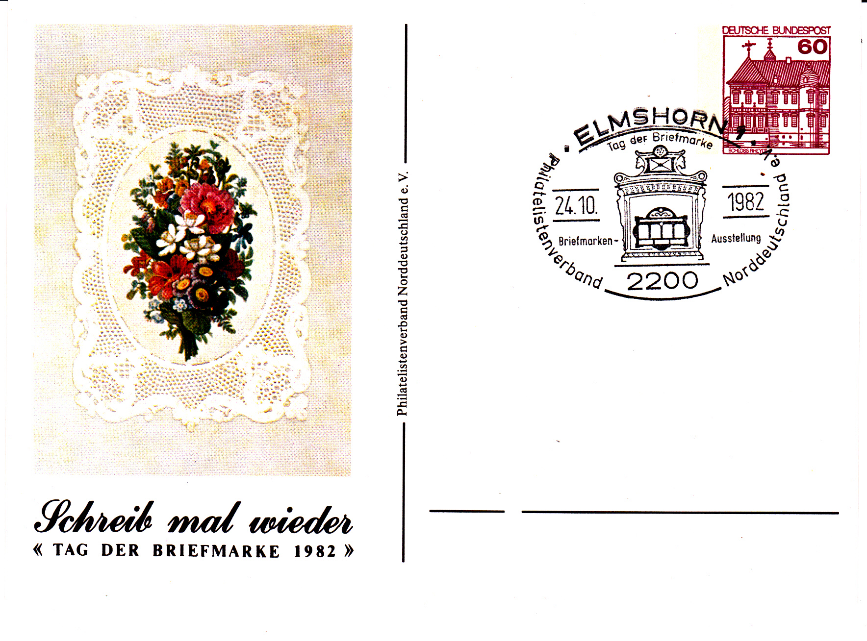 Im Philatelistenverband Norddeutschland fand die Veranstaltung zum Tag der Briefmarke 1982 in Elmshorn statt, wie diese Ganzsache mit Sonderstempel vom 24.10.1982 zeigt.