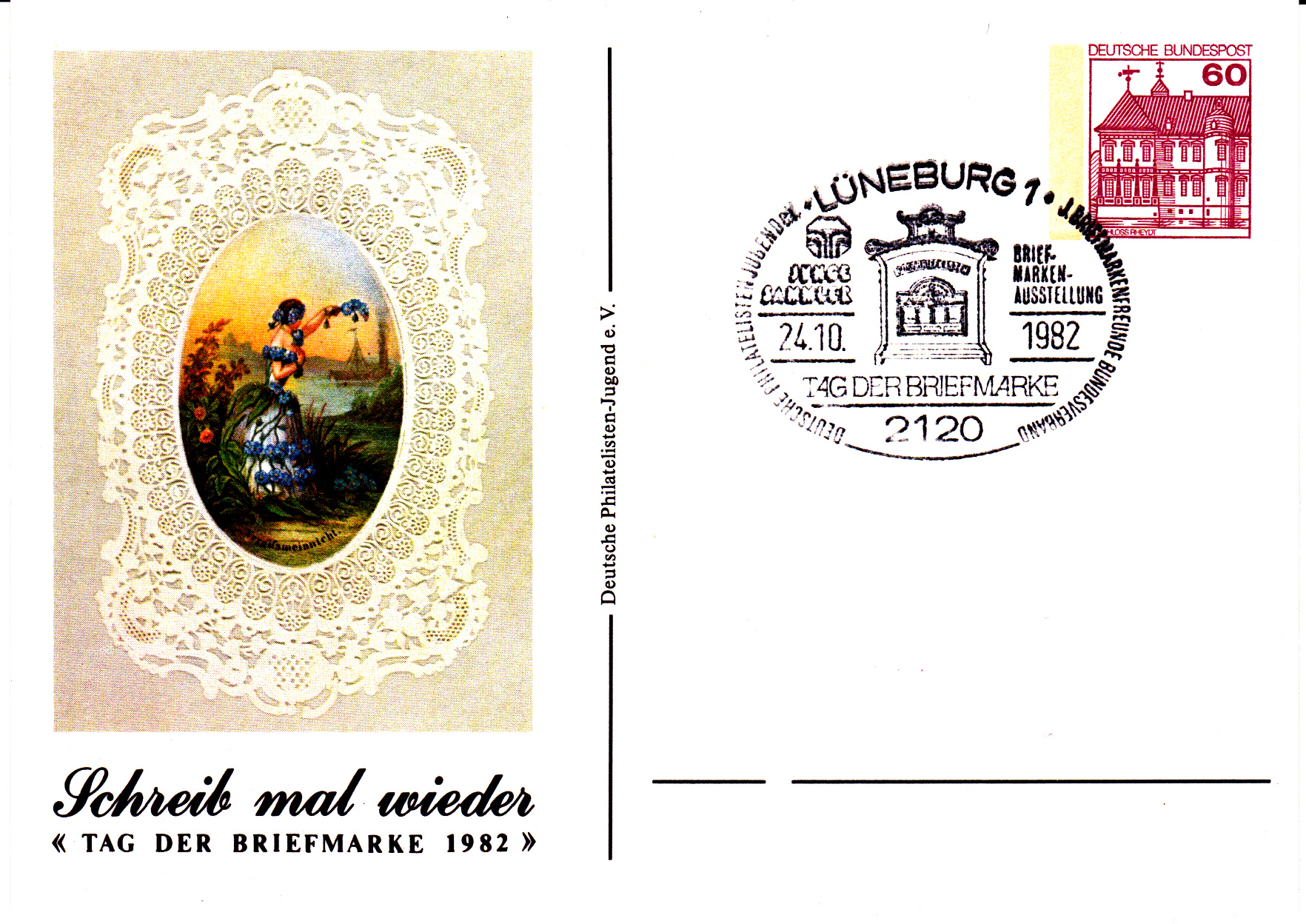 Auch die Deutsche Philatelisten Jugend e.V. beteiligte sich an der Aktion Tag der Briefmarke 1982 mit einer Veranstaltung und mit einer Ganzsache mit passendem Sonderstempel aus Lüneburg.