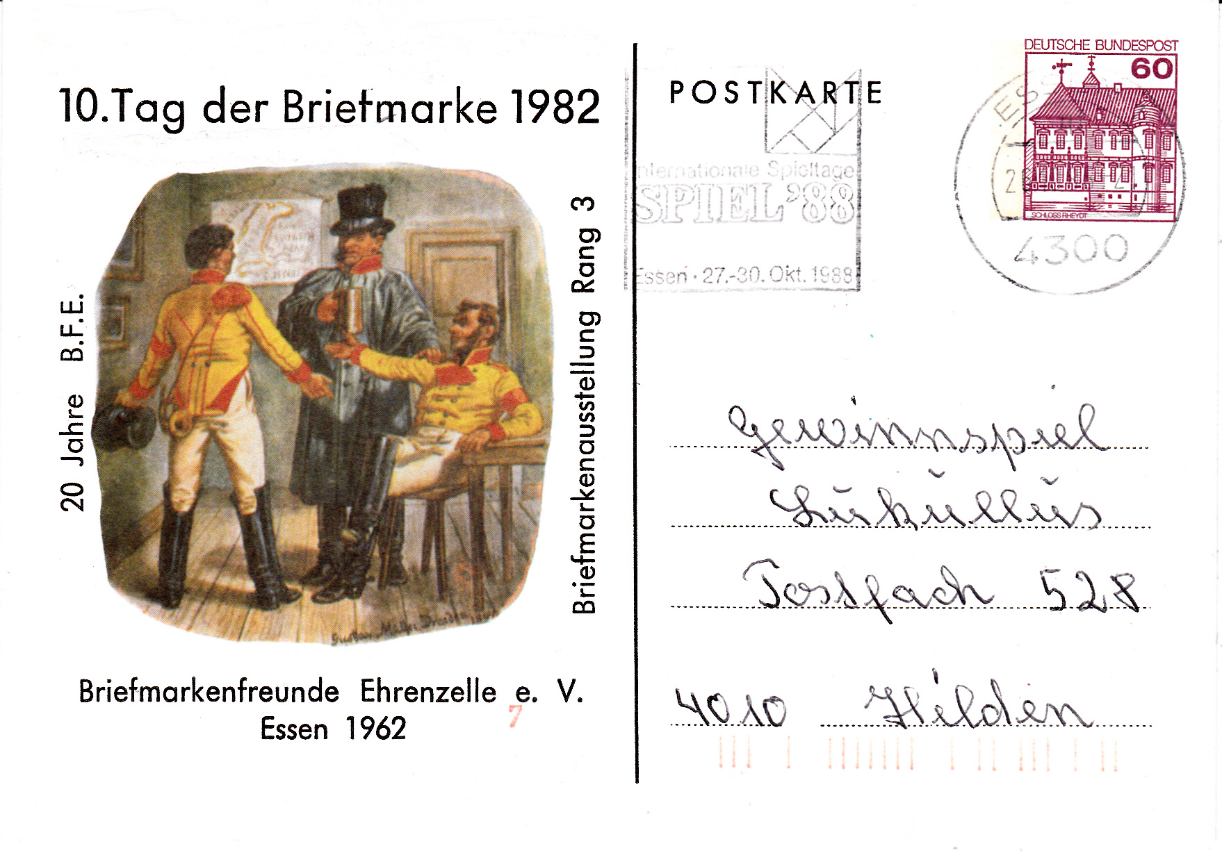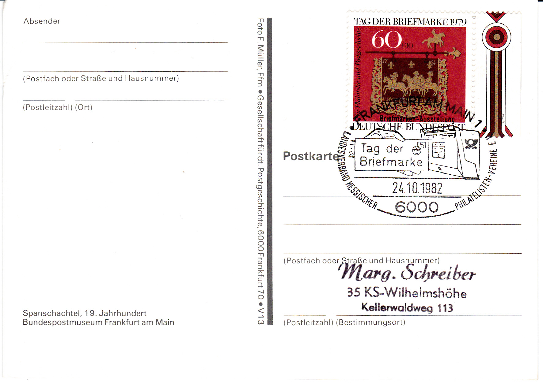 Der bereits auf Ganzsachenkarte gezeigte Sonderstempel zum Tag der Briefmarke 1982 aus Frankfurt am Main hier nun auf einer Karte mit der Marke zum Tag der Briefmarke 1979.