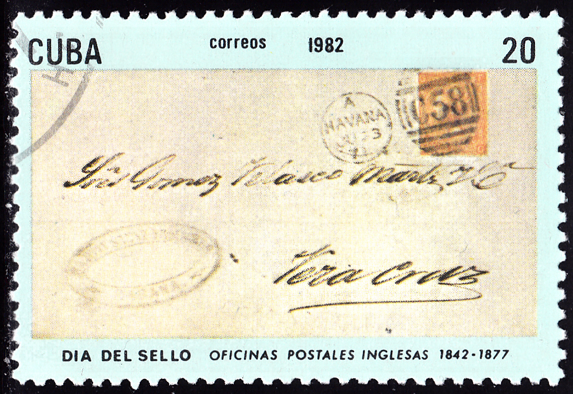 Am 24.4.1982 erschien in Kuba diese Sondermarke (MiNr 2656) zum Tag der Briefmarke 1982 mit der Abbildung eines Briefes der englischen Post auf Kuba.