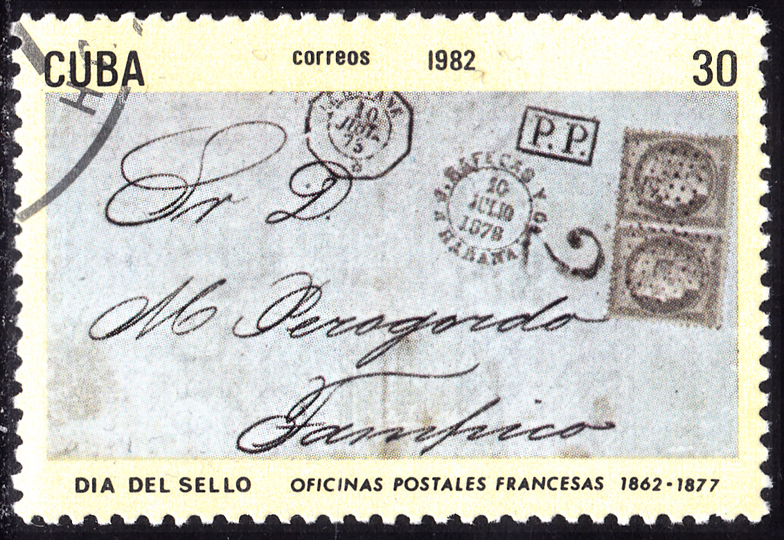 Die zweite Marke aus Kuba (MiNr 2657) zum Tag der Briefmarke 1982 zeigt eine Brief der französischen Post auf Kuba.