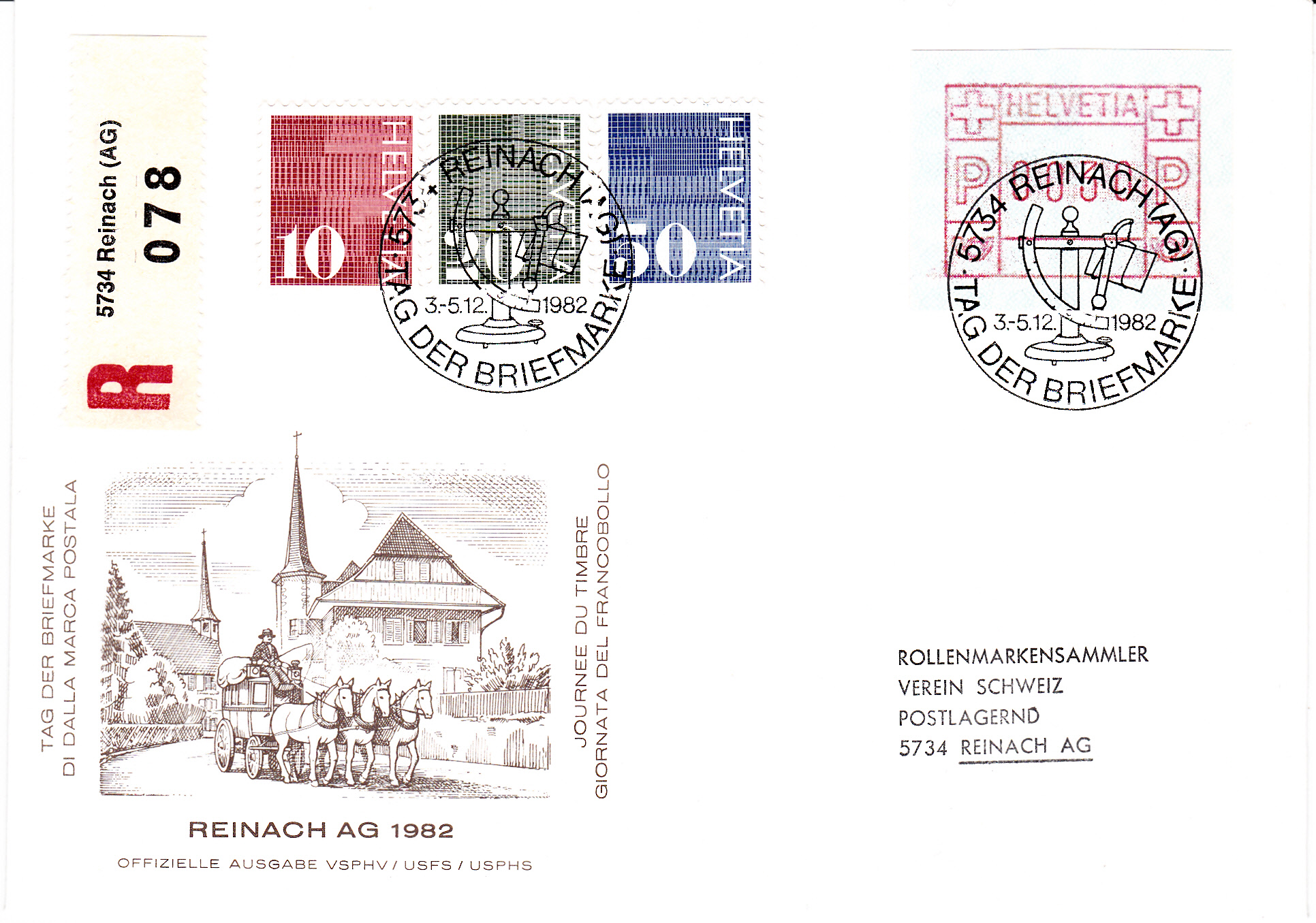 Maschinenwerbestempel aus Belinzona vom 3.12.1982 zu einer Briefmarkenausstellung zum Tag der Briefmarke 1982 und zum Jubiläum "100 Jahre Gotthardbahn".