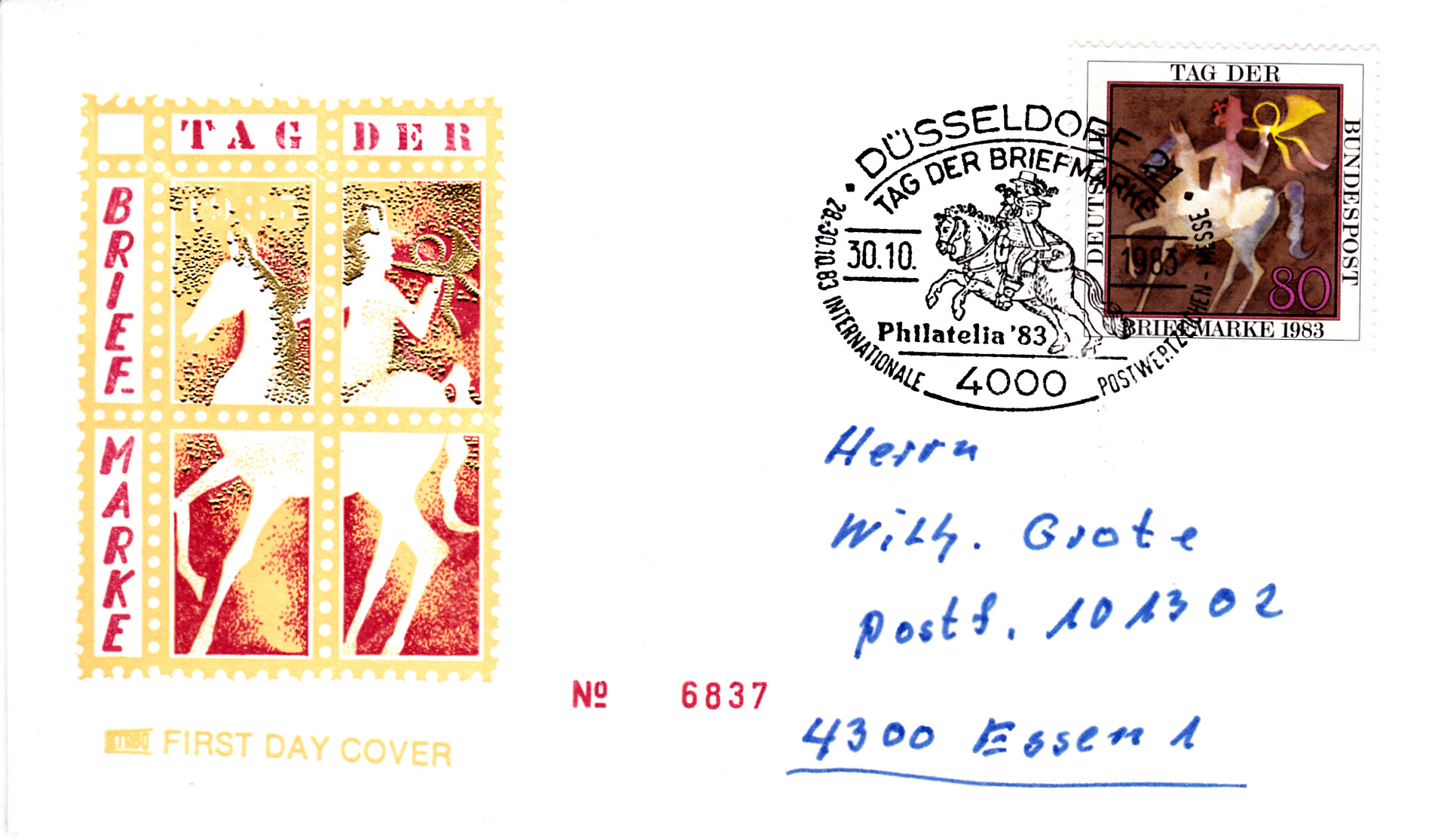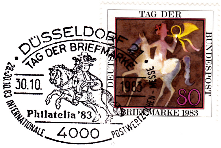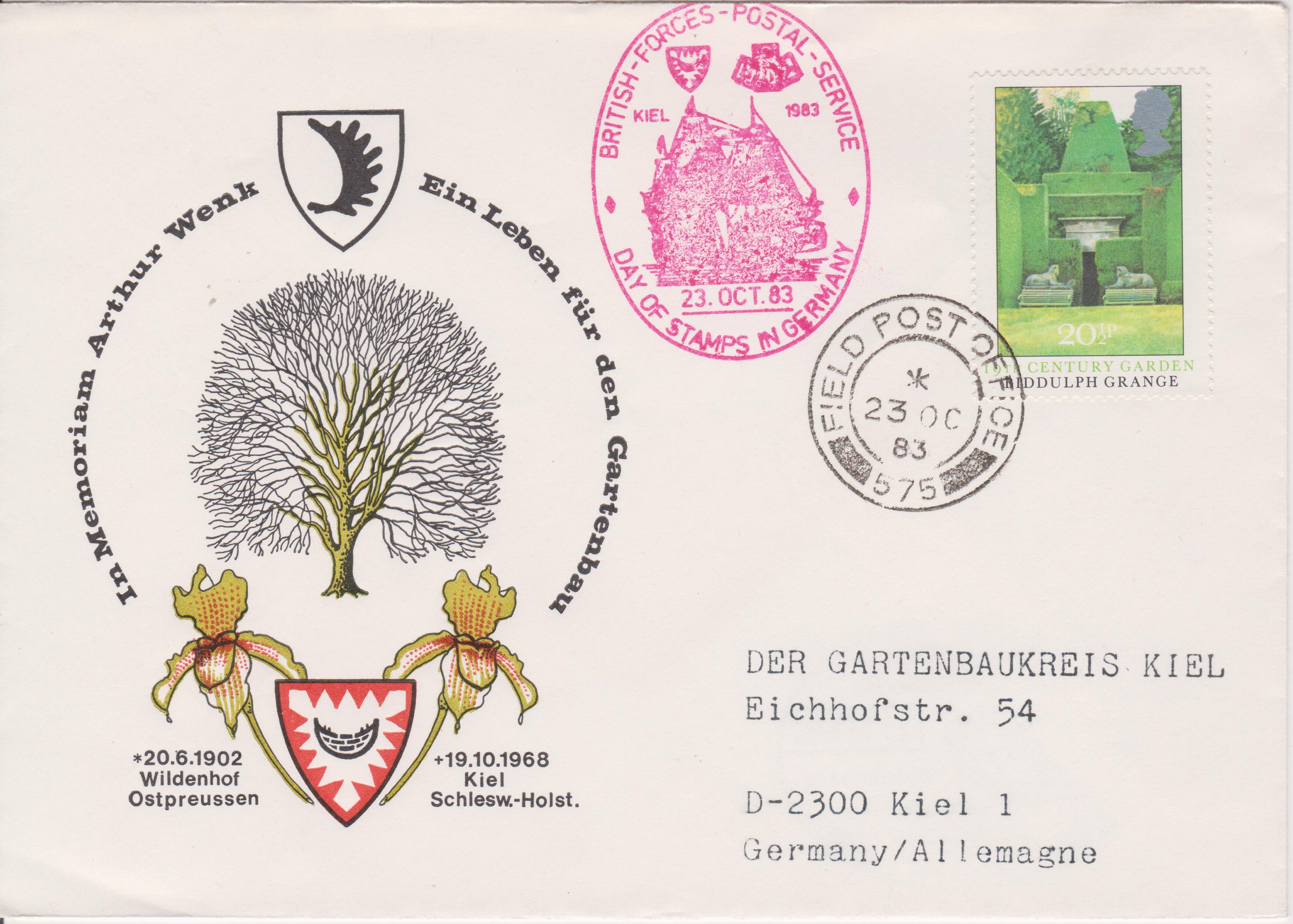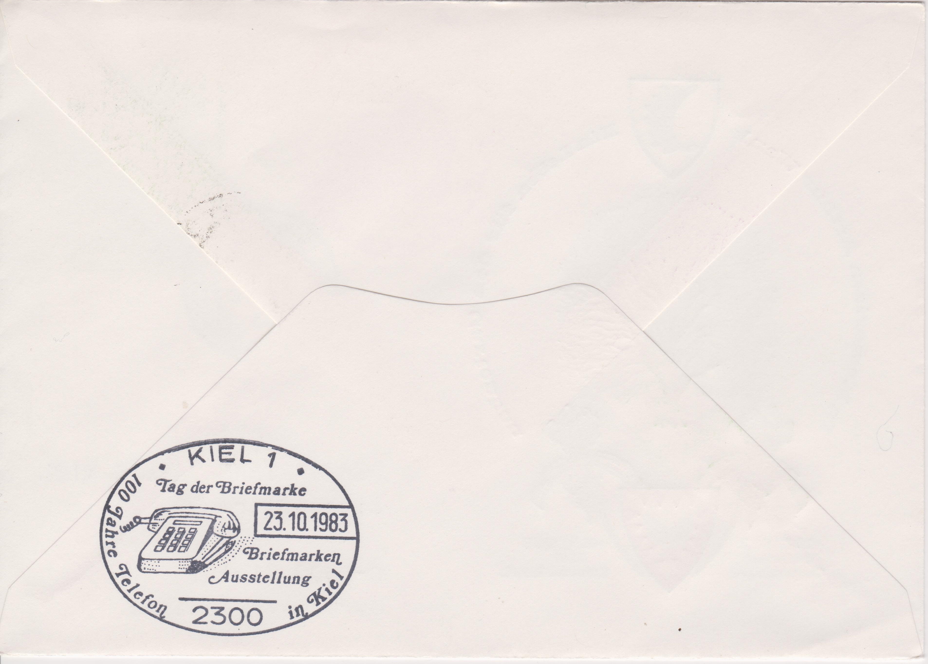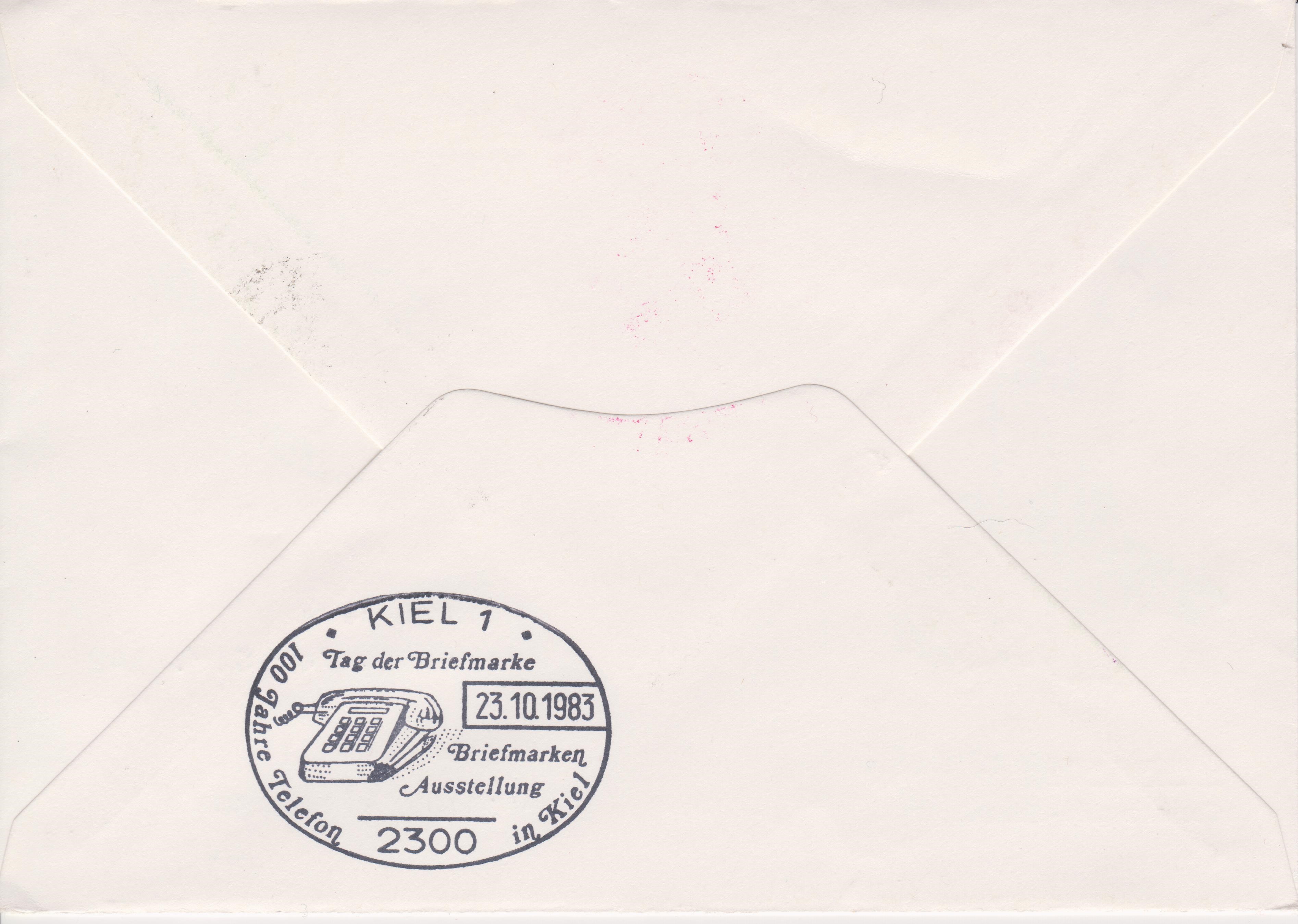 Rückseitig wurde in KIEL 1 am 23.10.1983 ein Sonderstempel Tag der Briefmarke blanko abgeschlagen: