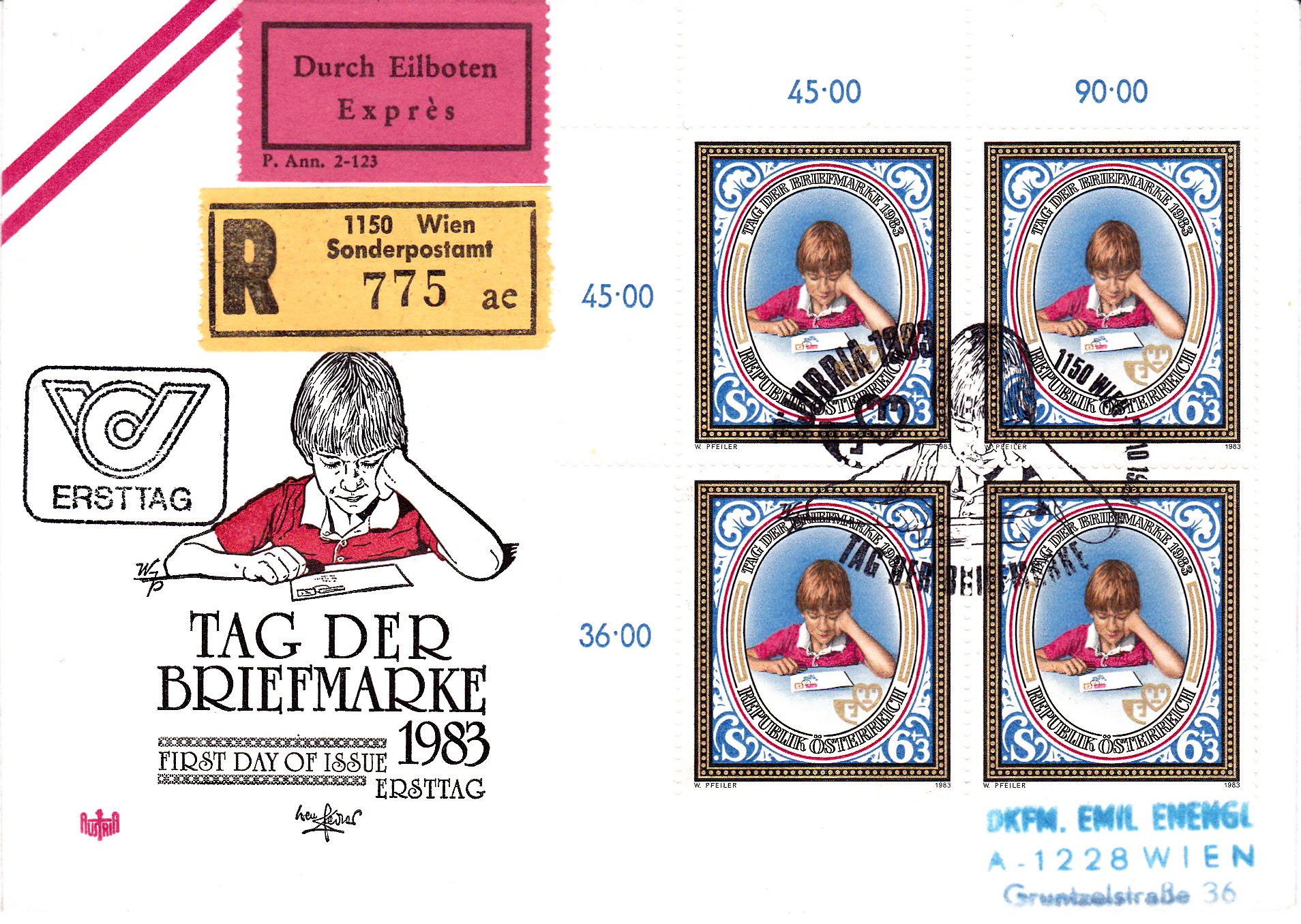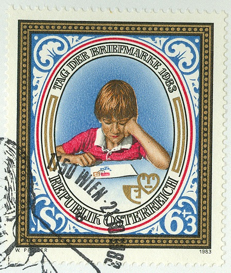 Zum Tag der Briefmarke 1983 erschien am 21.10.1983 in Österreich diese Marke (MiNr 1756) Mit der Abbildung eines Kindes beim Betrachten eines Briefumschlages.