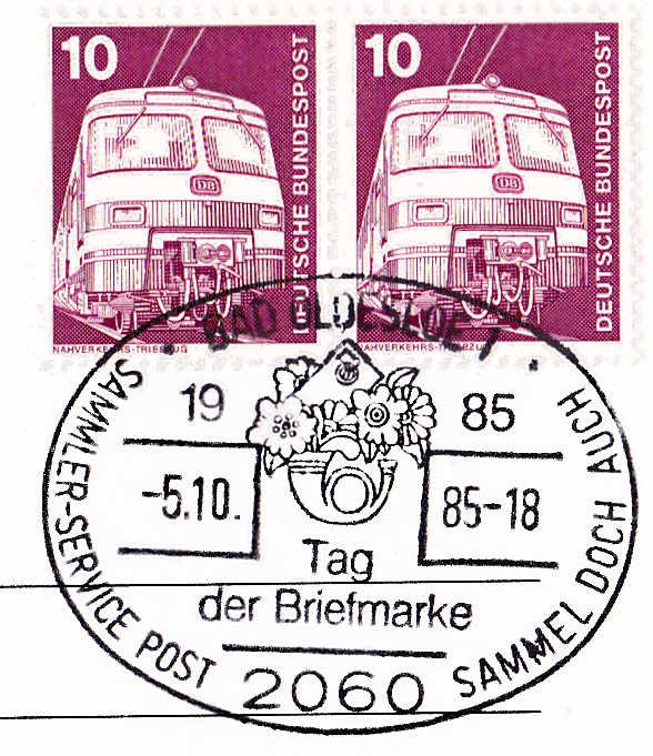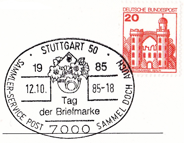 Der Sammler-Service der Post beteiligte sich an den Aktionen zum Tag der Briefmarke 1985 auch mit zahlreichen bildgleichen Sonderstempel.