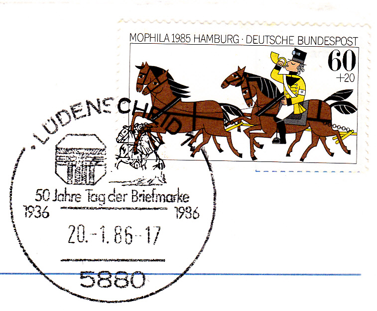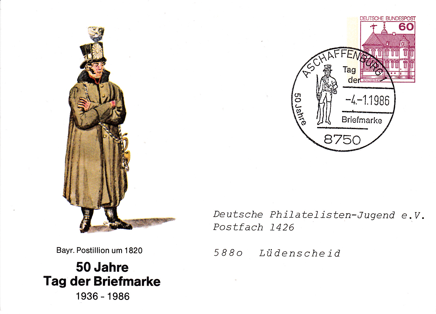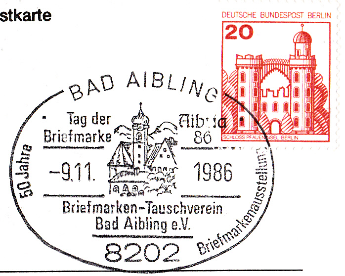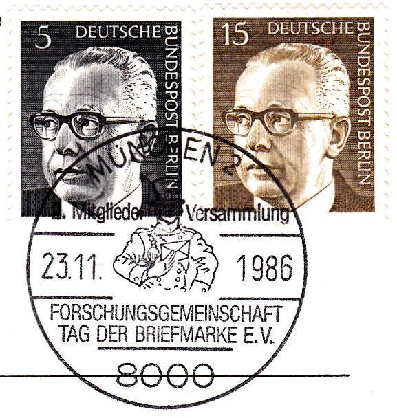 Dieser Sonderstempel vom 23.11.1986 aus München ist zwar nicht unmittelbar zum Tag der Briefmarke erschienen, passdt aber doch in eine Sammlung Tag der Briefmarke. Er dokumentiert eine Mitgliederversammlung der Forschungsgemeinschaft Tag der Briefmarke e.V.