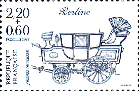 In Frankreich erschien am 14.3.1987 eine Marke zum Tag der Briefmarke 1987 mit der Abbildung einer Postkutsche "Berline" (1837). Die Marke ist im Bogen (MiNr 2600 A a)in der Farbe schwarzbraun auf weißgelbem Papier mit der Zähnung K 12 3/4:13 und im Markenheftchen in der Farbe (MiNr 2600 C b) schwarzblau auf weißblauem Papier in der Zähnung K 13 erschienen.