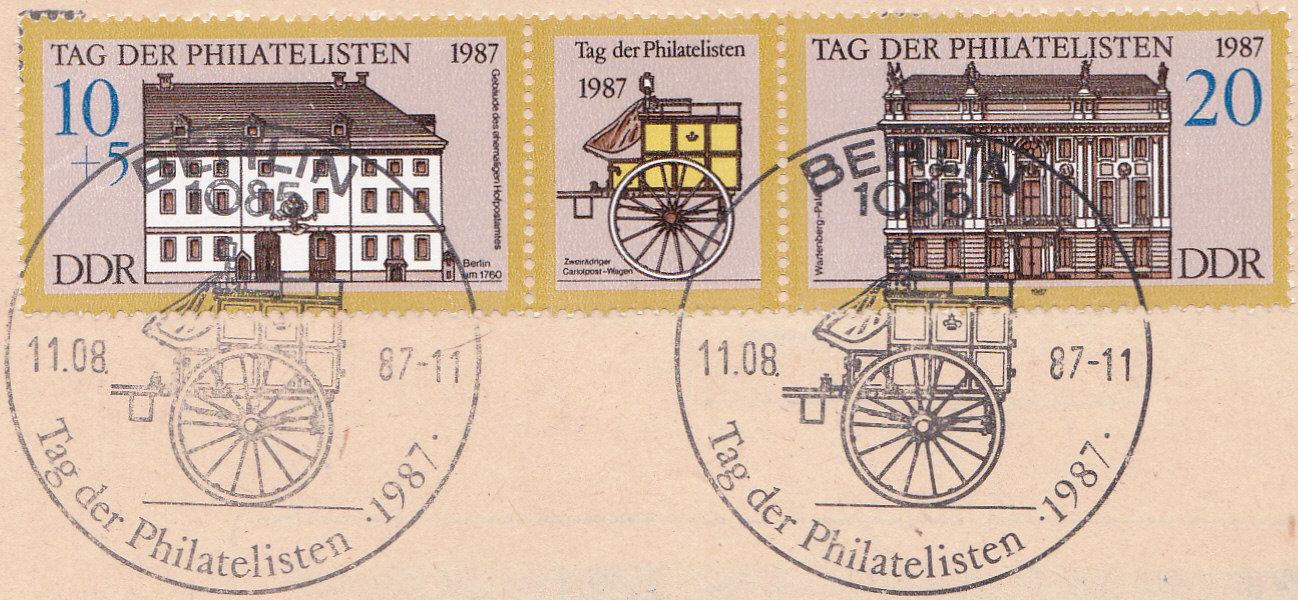 In der DDR erschien 1987 wieder ein Ausgabe zum "Tag der Philatelisten". Due beiden Marken (MiNr 3118 und 3119) wurden durch Zierfeld verbunden,waagerecht zusammenhängend gedruckt. Die Marken zeigen das ehemalige Hofpostamt in Berlin (um 1760) und das Wartenbergpalais in Berlin. Hier zeige ich einen Zusammendruck: