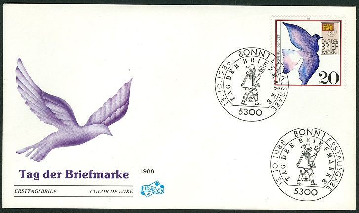 Zum Tag der Briefmarke 1988 wurde das Motiv "Brieftaube" künstlerisch umgesetzt. Hier auf einem FDC (FIDACOS) und Bonner Sonderersttagsstempel.