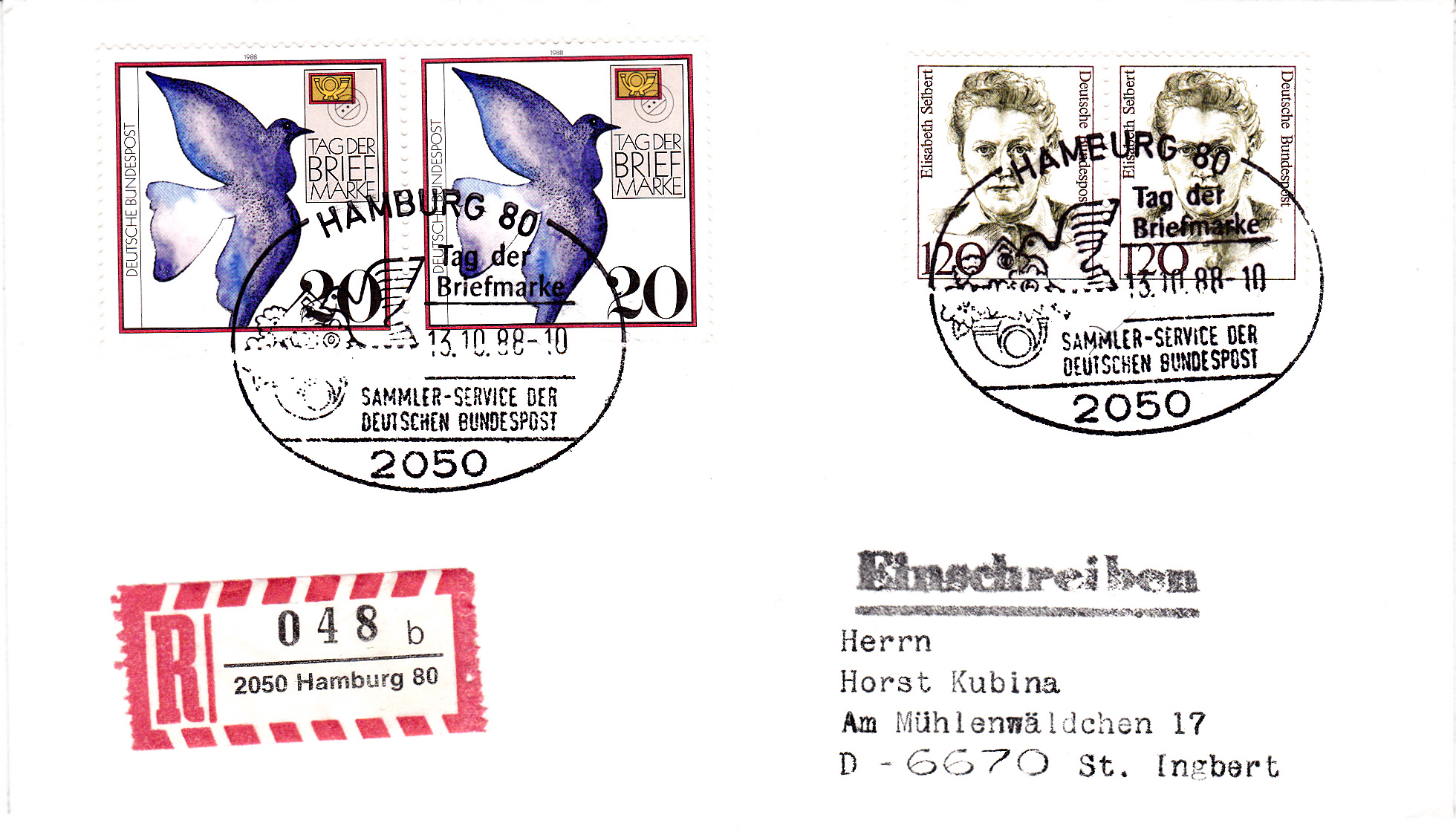 Dieser Brief per Einschreiben wurde Ersttag der Marke zum Tag der Briefmarke 1988 in Hamburg mit einem Sonderstempel zum Tag der Briefmarke gestempelt.