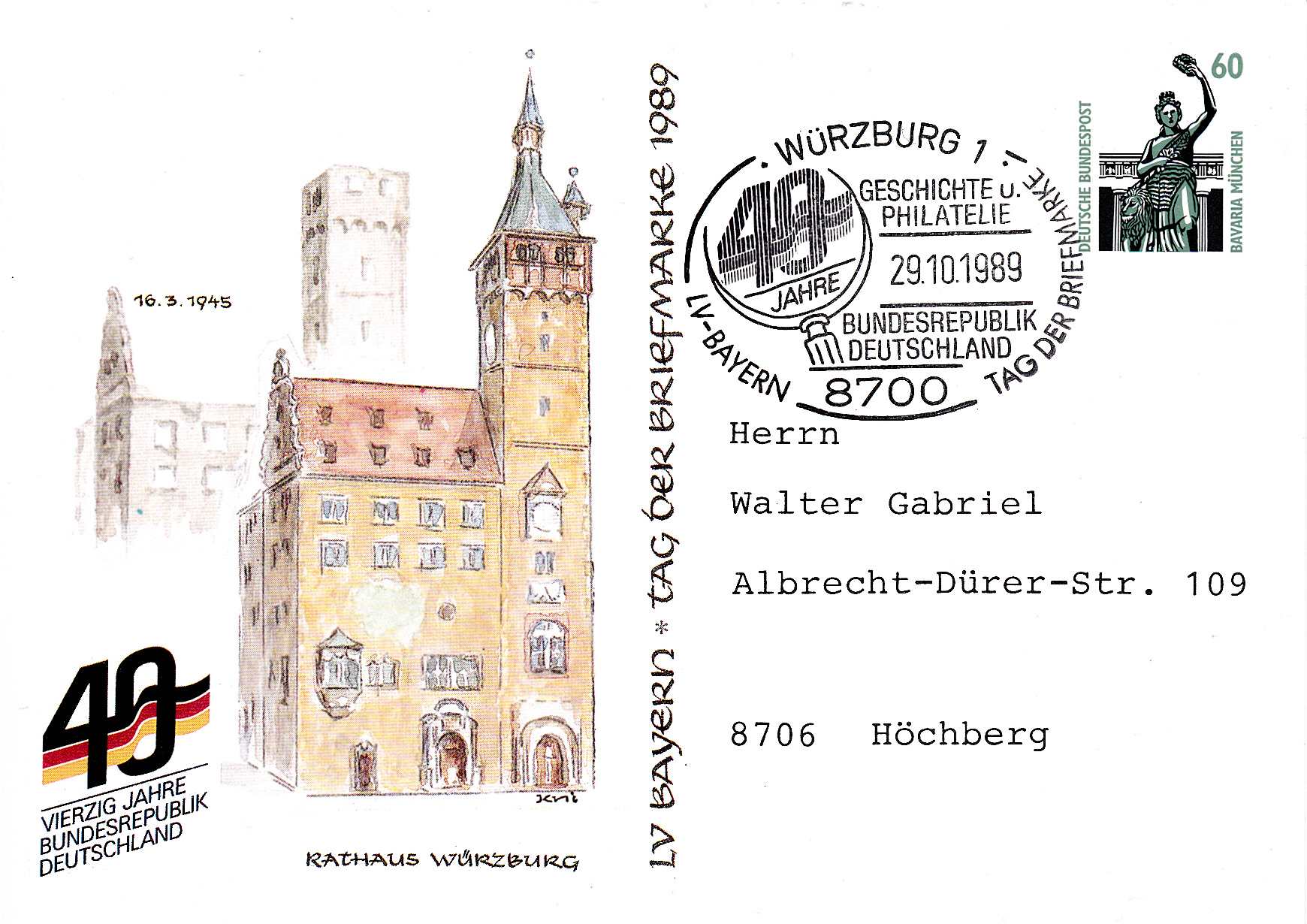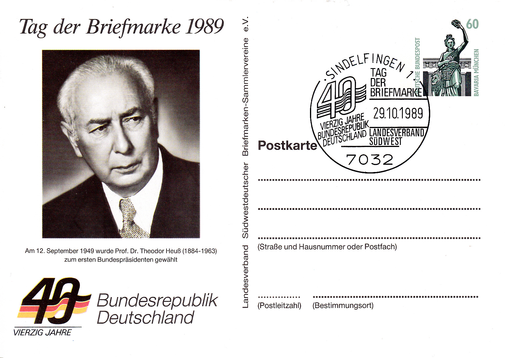 Ganzsachenumschlag zum Tag der Briefmarke 1989 des Verbandes Niedersächsischer Philatelistenvereine e.V. mit dem dazugehörenden Sonderstempel vom 29.10.1989 aus Hannover. Im Stempel wird ein Porträt des ersten