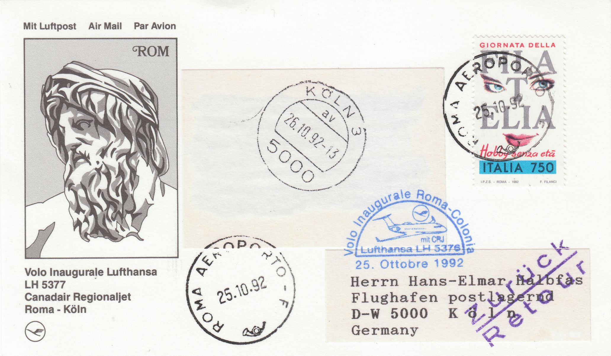 EF der Sondermarke aus Italien zum Tag der Briefmarke 1992 auf Postkarte, die am 25.10.1992 auf dem Erstflug in einem Bombardier Canadair Regionaljet der Lufthansa von Rom nach Köln befördert wurde: