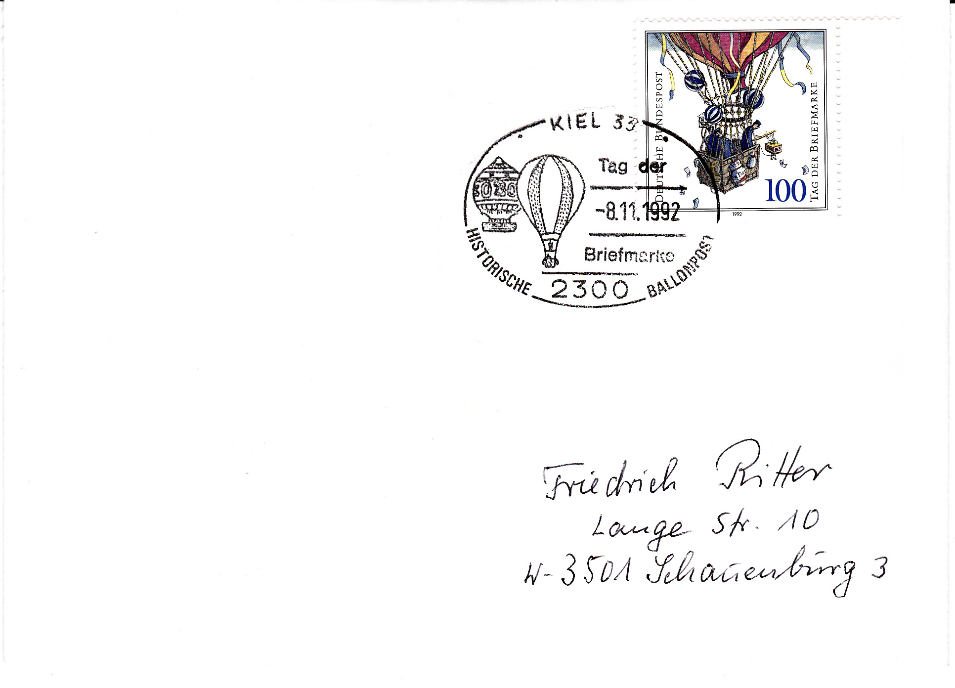 Sonderstempel zum Tag der Briefmarke 1992 vom 8.11.1992 aus W-2300 Kiel 1 mit Darstellung zur historischen Ballonpost, passend zur Marke zum TdB 1992.