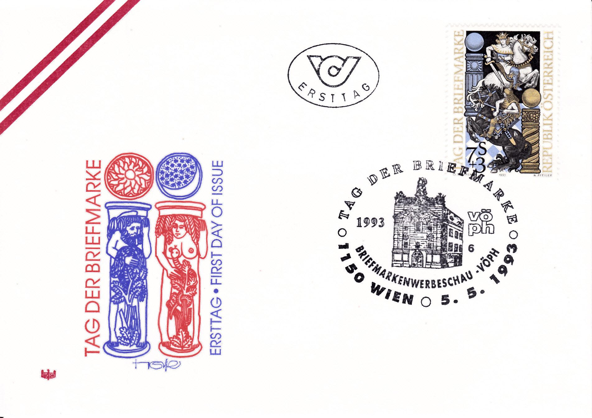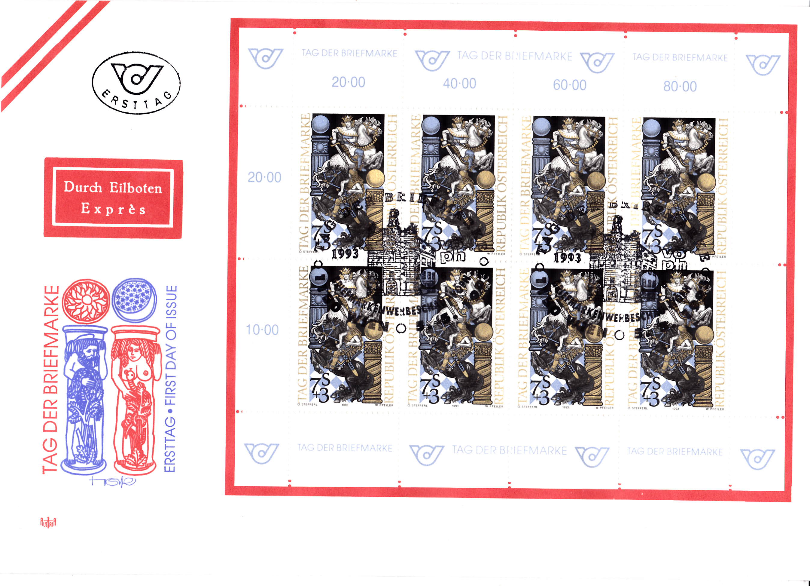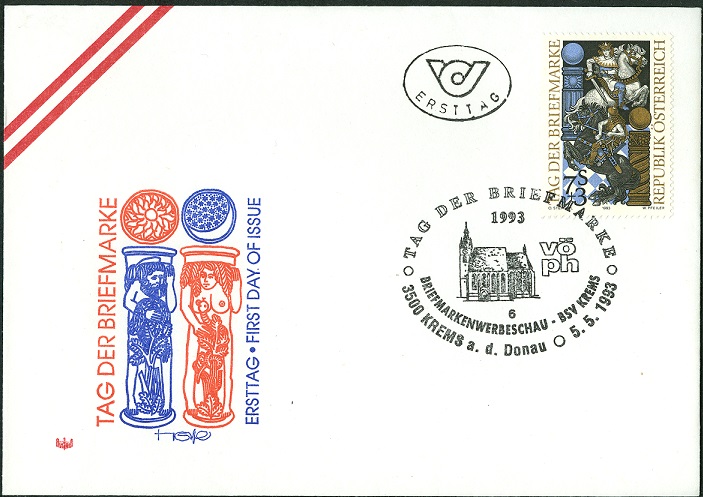 Ersttag der Ausgabe "Tag der Briefmarke 1993" war der 5. Mai 1993. Ein Blick in einen MICHEL für Österreich könnte erbringen, dass hier eine Spielszene aus dem Schach gezeigt wird. Weiß beginnt, hat das Schwert bereits gezogen, und Schwarz verteitigt den weißen Springer-Angriff. Ein blau/weißes Schachbrett ist künstlerische Freiheit.