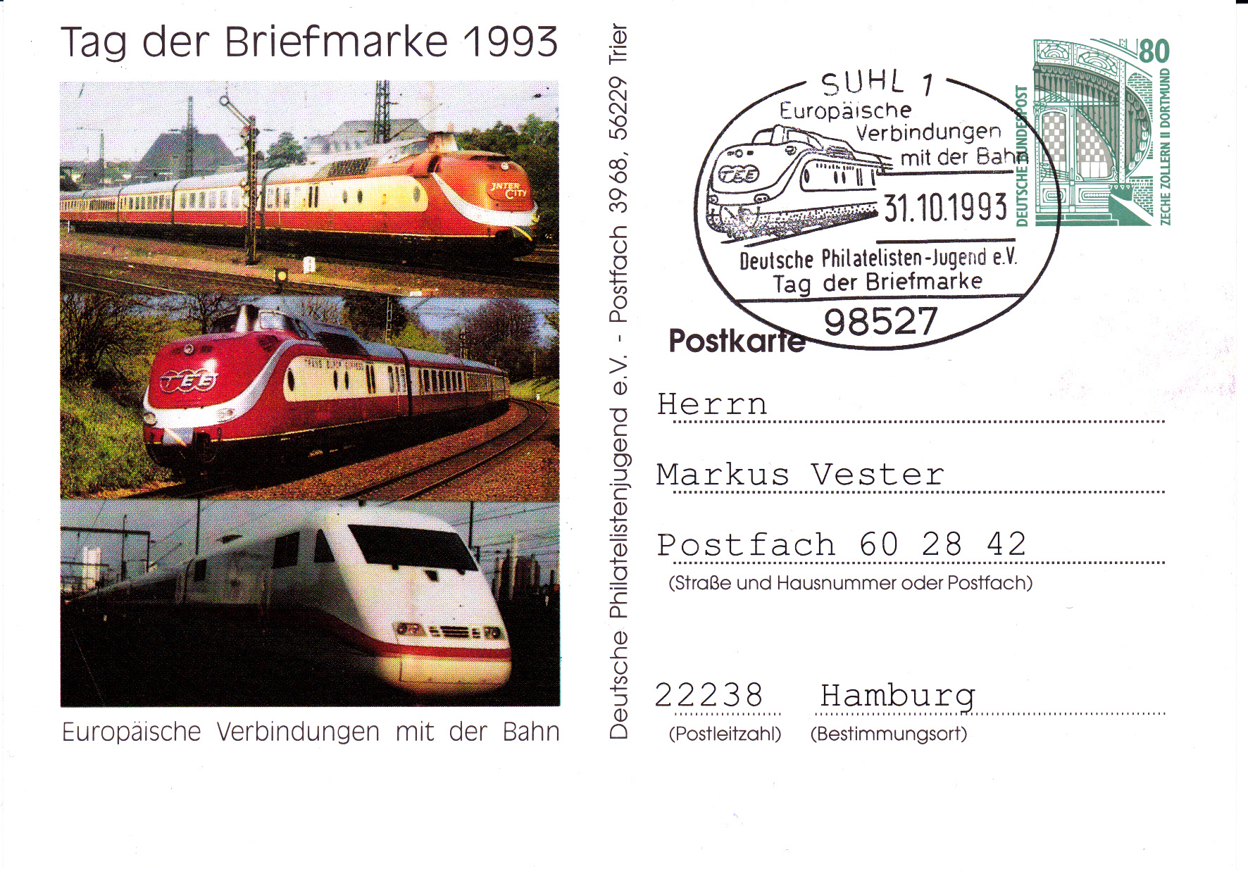 Die Deutsche Philatelisten Jugend e.V. stellte auf ihrer Ganzsachenpostkarte das Thema "Europäische Verbindungen mit der Bahn" dar. Der dazu passende Sonderstempel wurde beim Postamt 98527 Suhl geführt.